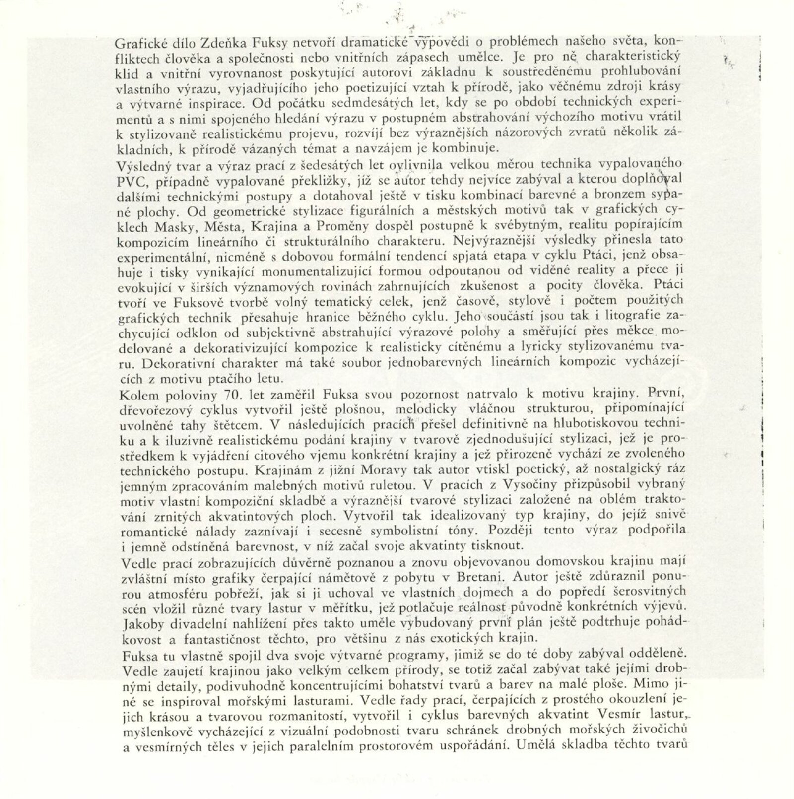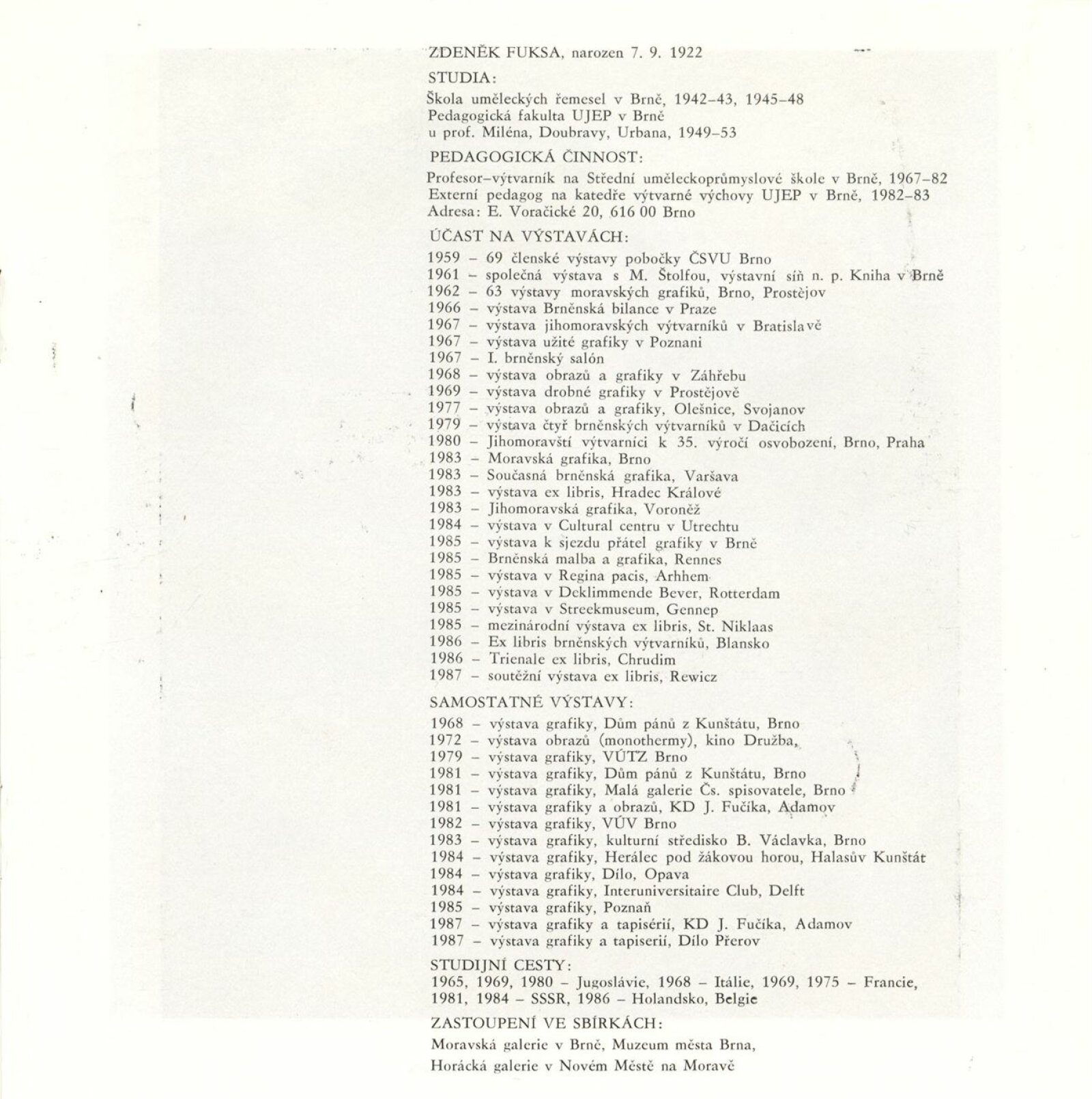 Zdeněk Fuksa. Grafické cykly: Galerie Stará radnice, 17. 9. – 18. 10. 1987 / Text: Michal Gregor. – Brno: DUmB, 1987. – [17] s., obr., životní data, výstavy, zastoupení ve sbírkách, GSR 8. – MZK; MG