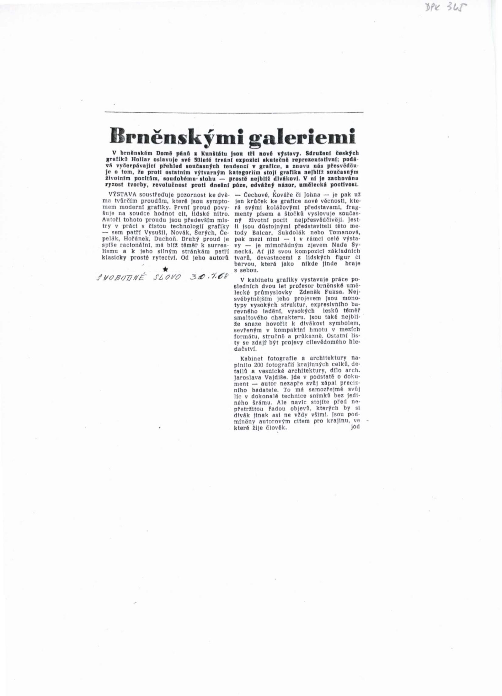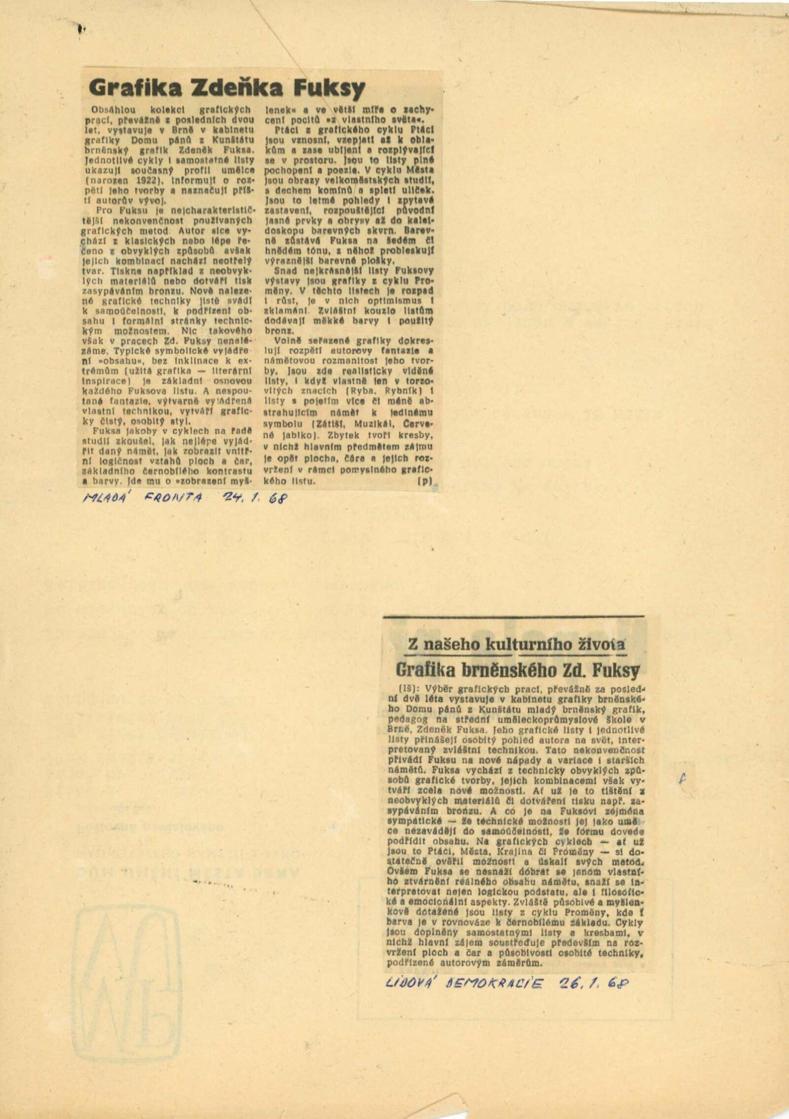 Zdeněk Fuksa. Grafika: Dům umění města Brna / Dům pánů z Kunštátu, 89. výstava Kabinetu grafiky, 12. 1. – 5. 2. 1968 / Text: Václav Zykmund. – Brno: DUmB, 1968. – 12 s., obr., resumé 4 s., DPK 365. – MZK; MG