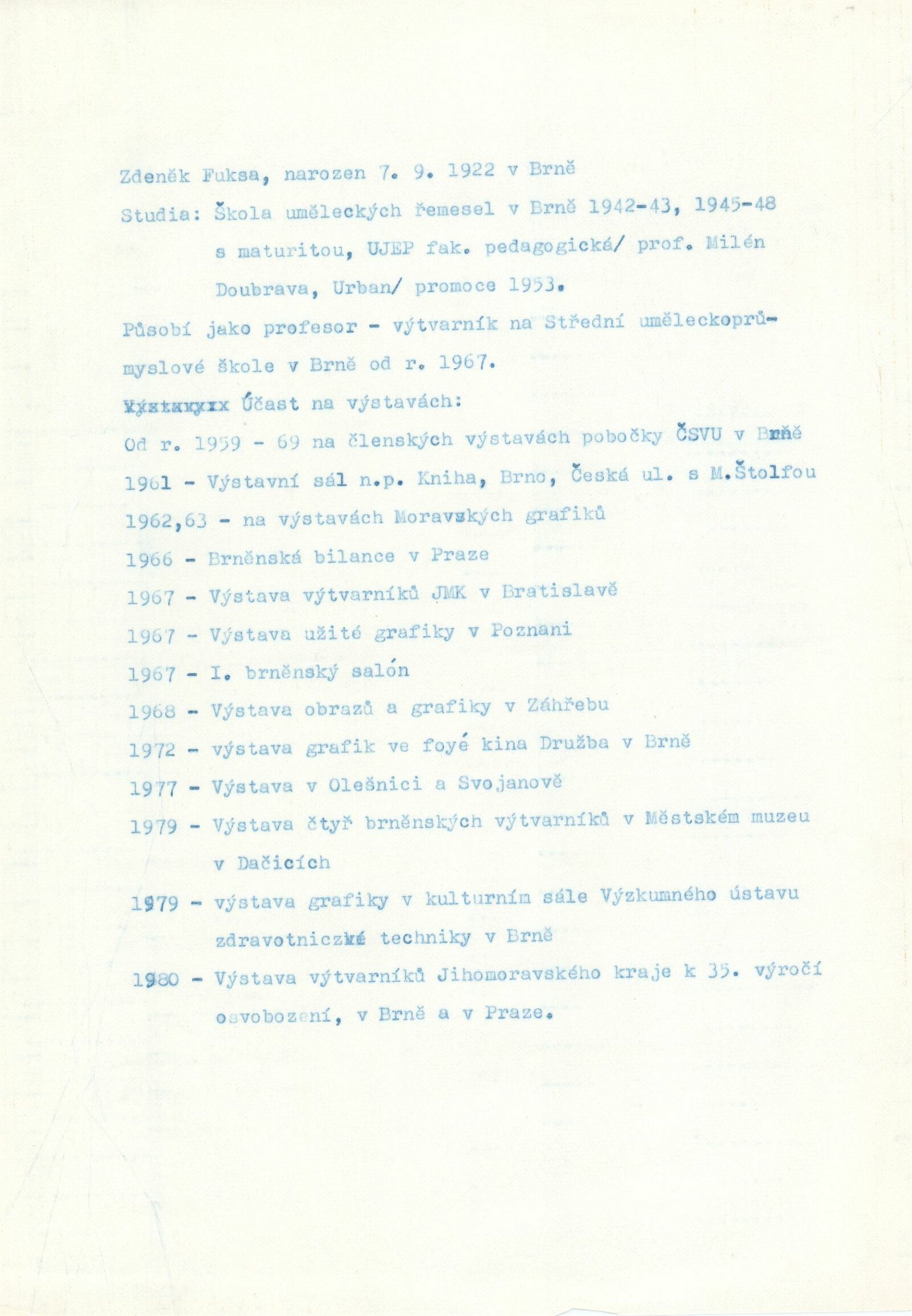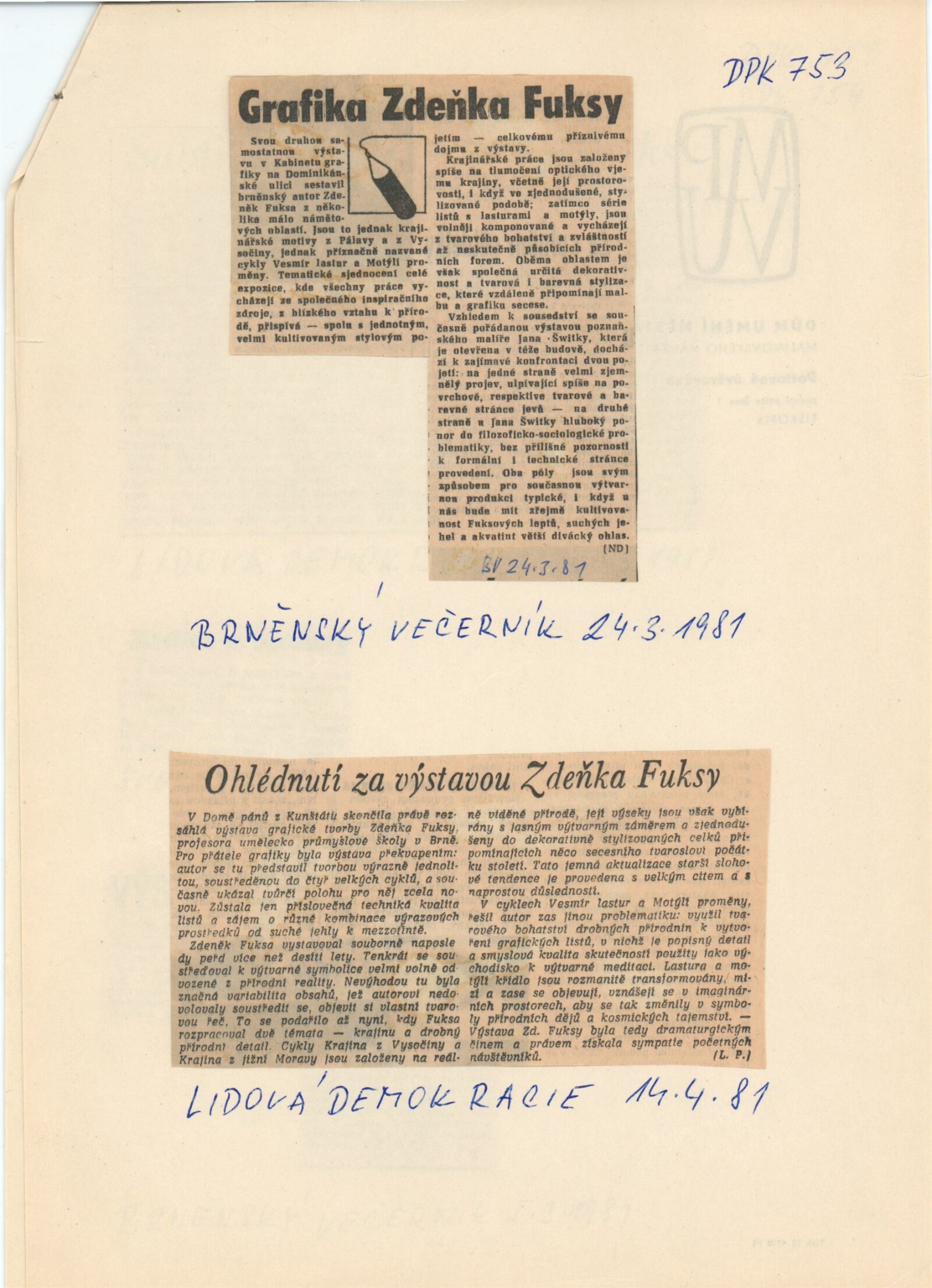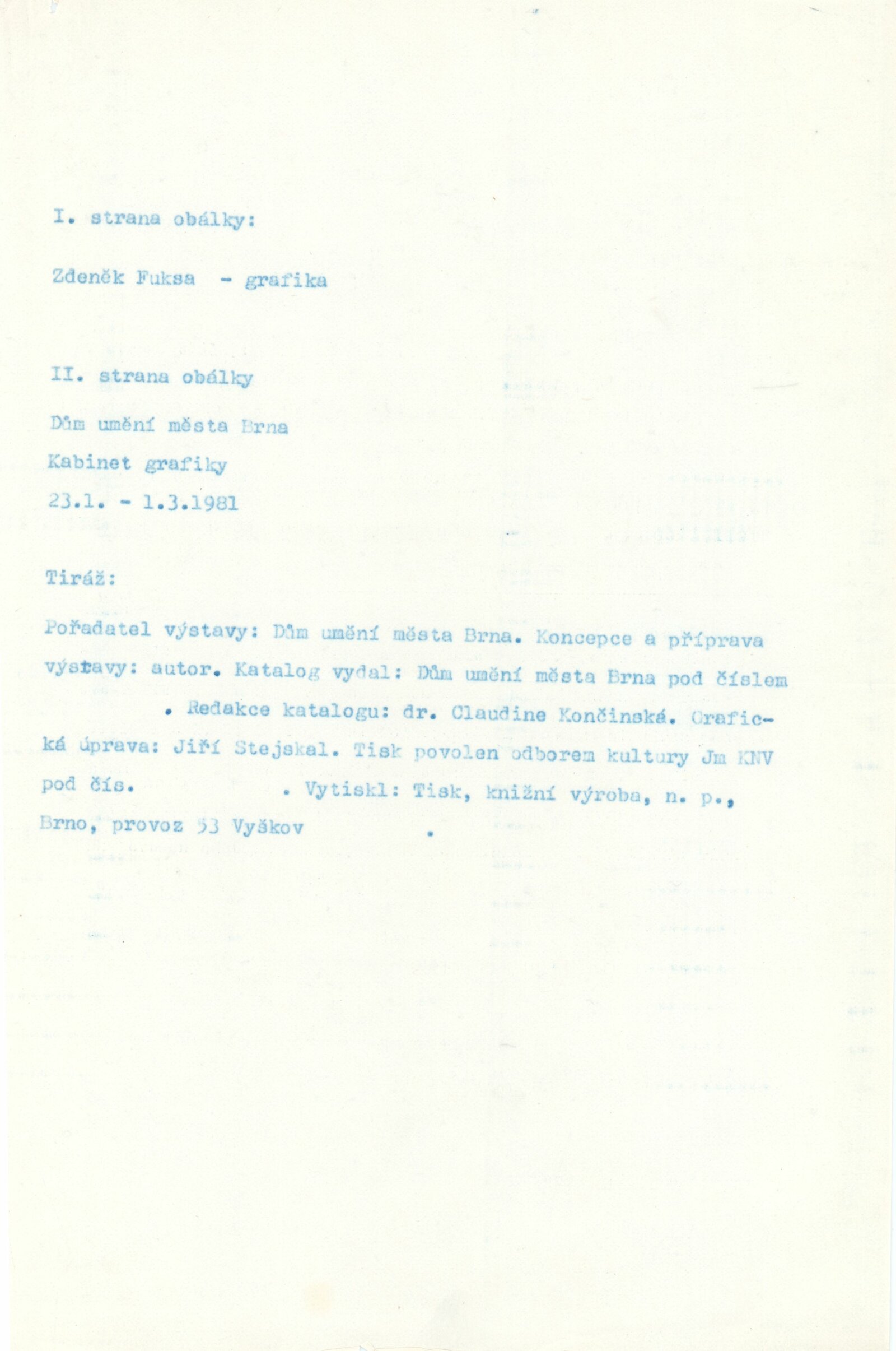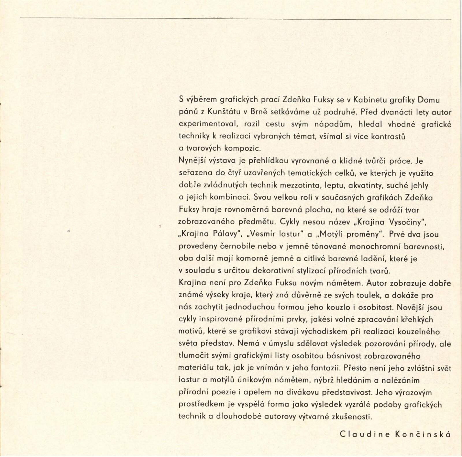 Zdeněk Fuksa. Grafika: Dům umění / Dům pánů z Kunštátu, Kabinet grafiky, 6. 3. – 5. 4. 1981 / Text: Claudine Končinská. – Brno: DUmB, 1981. – 9 s., obr., životní data, výstavy, DPK 753. – MZK; MG