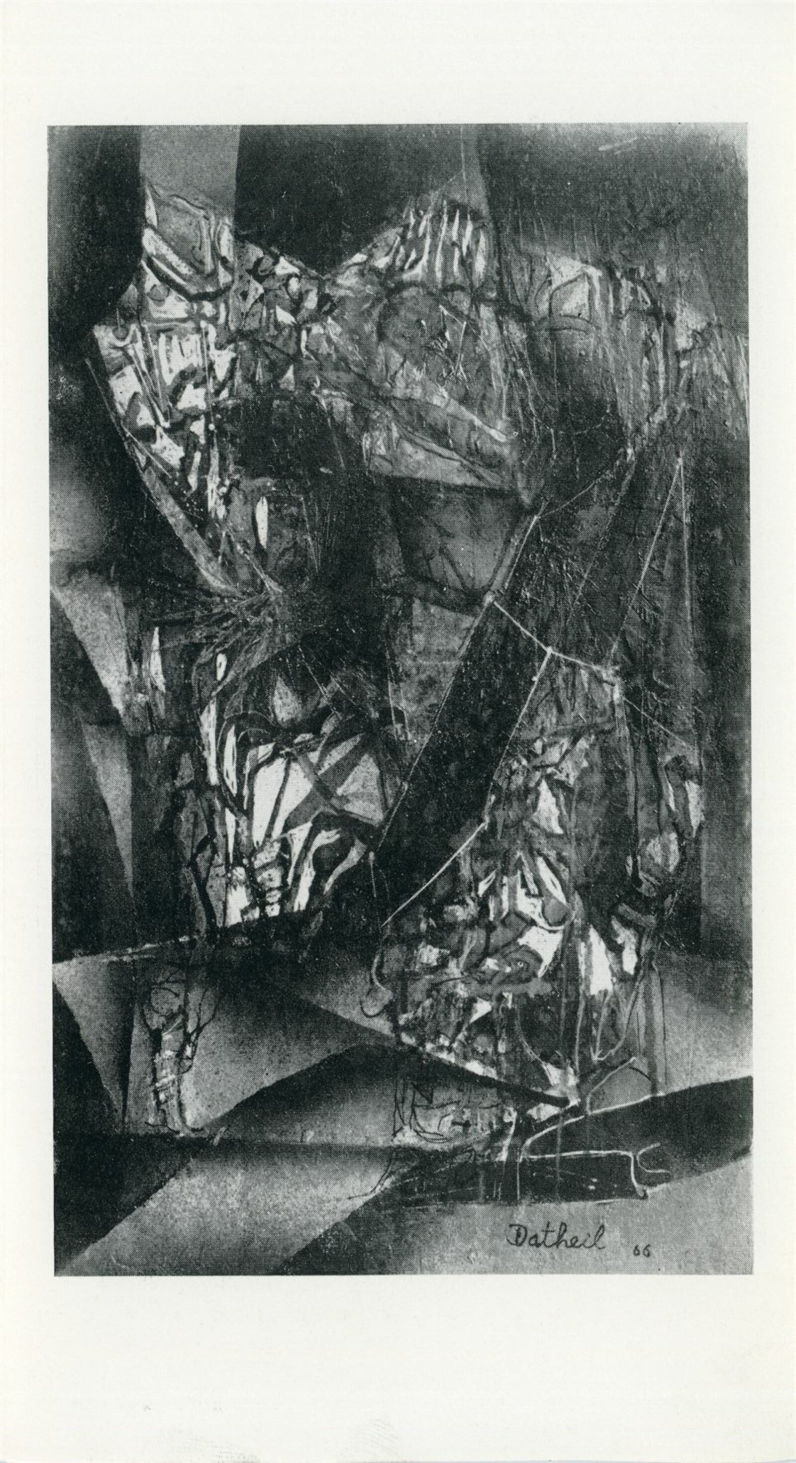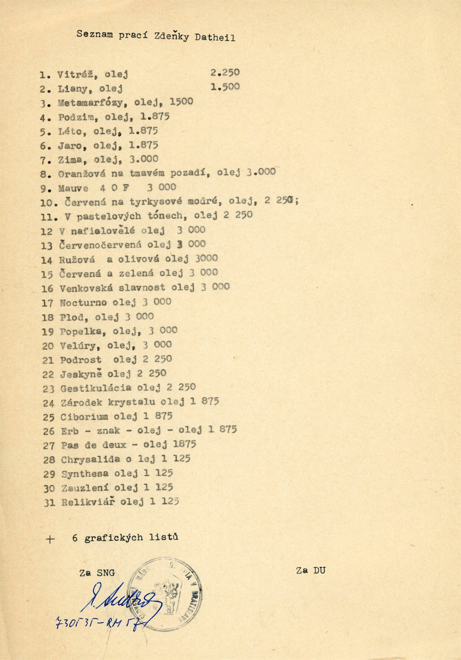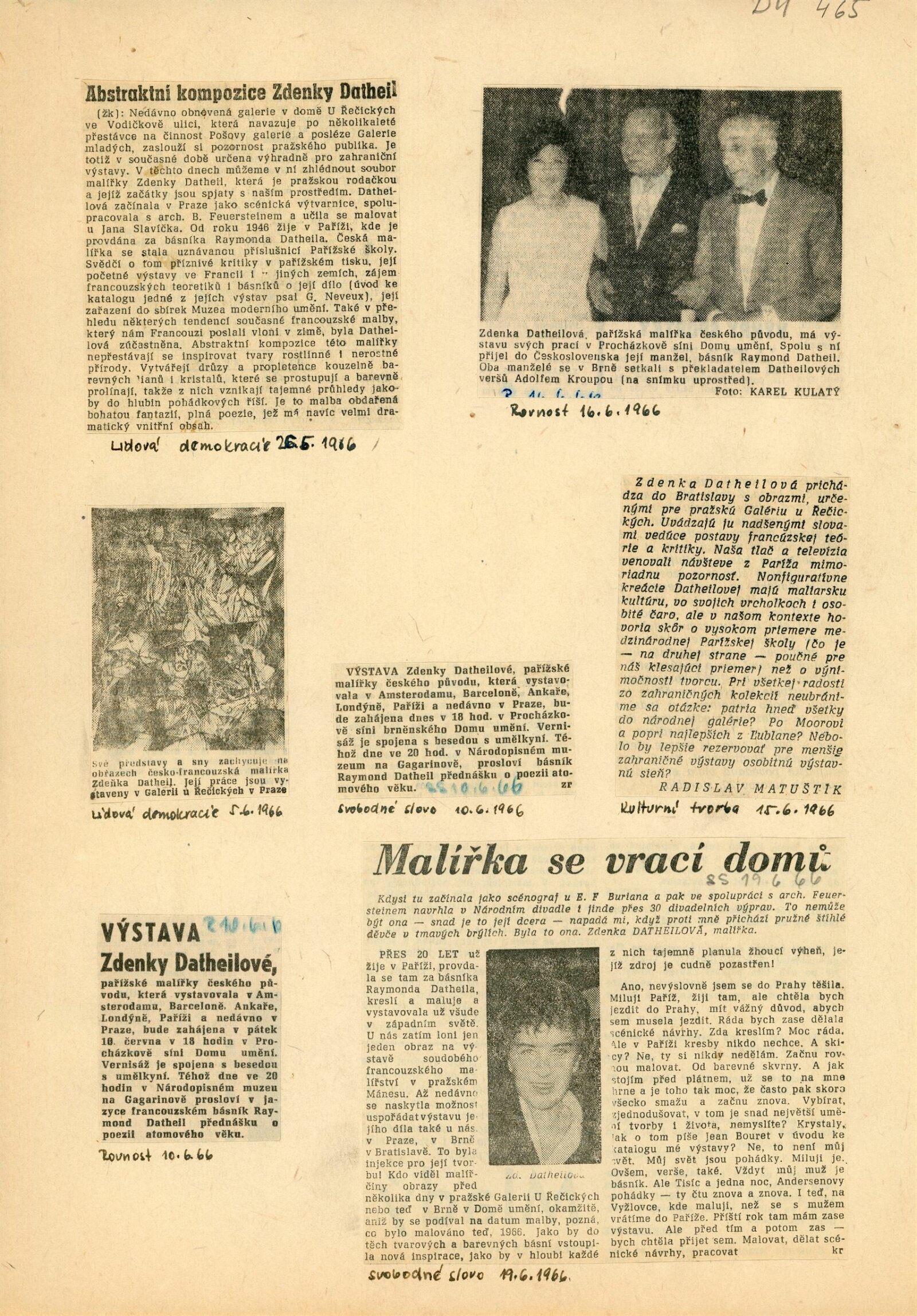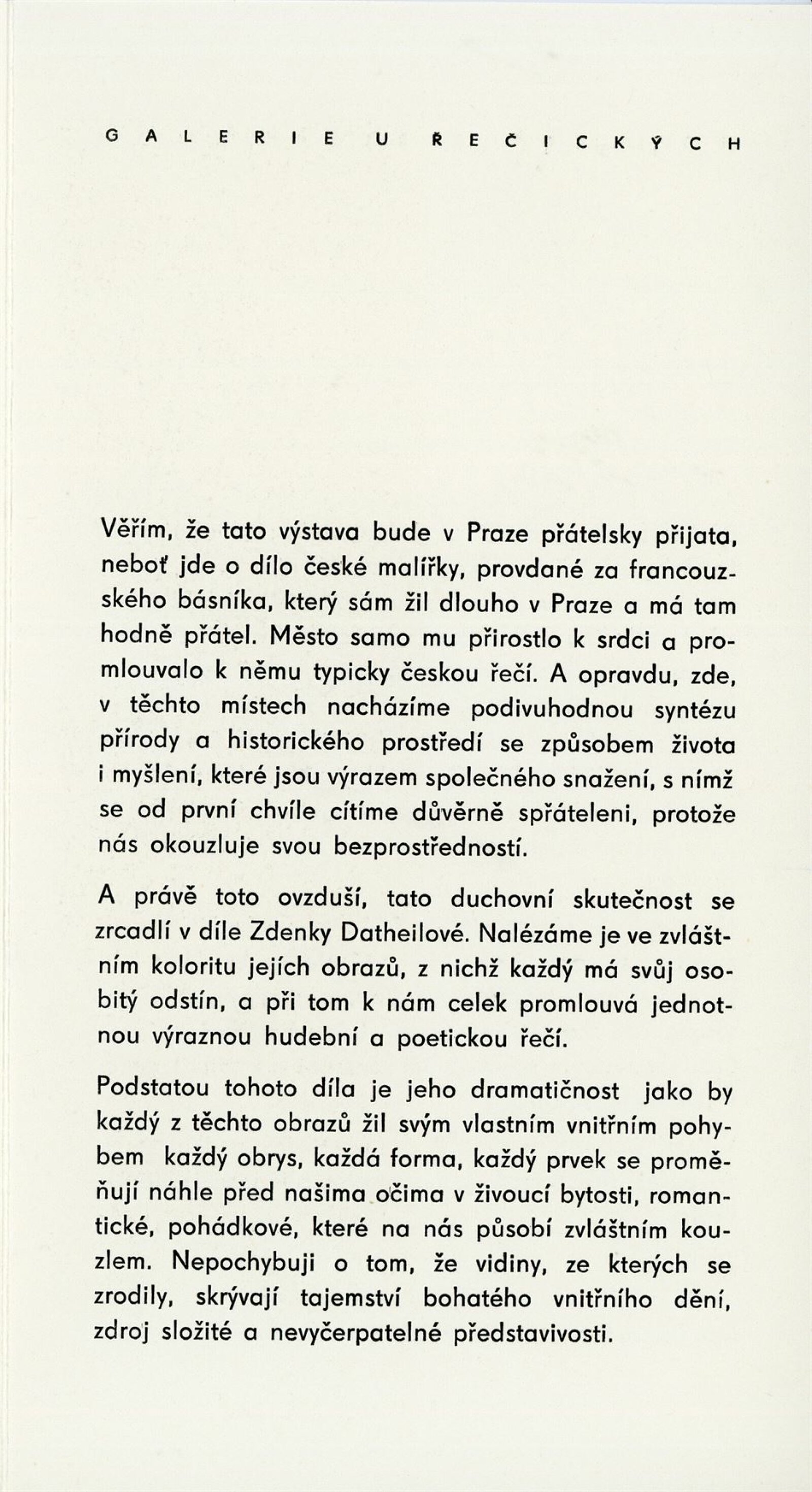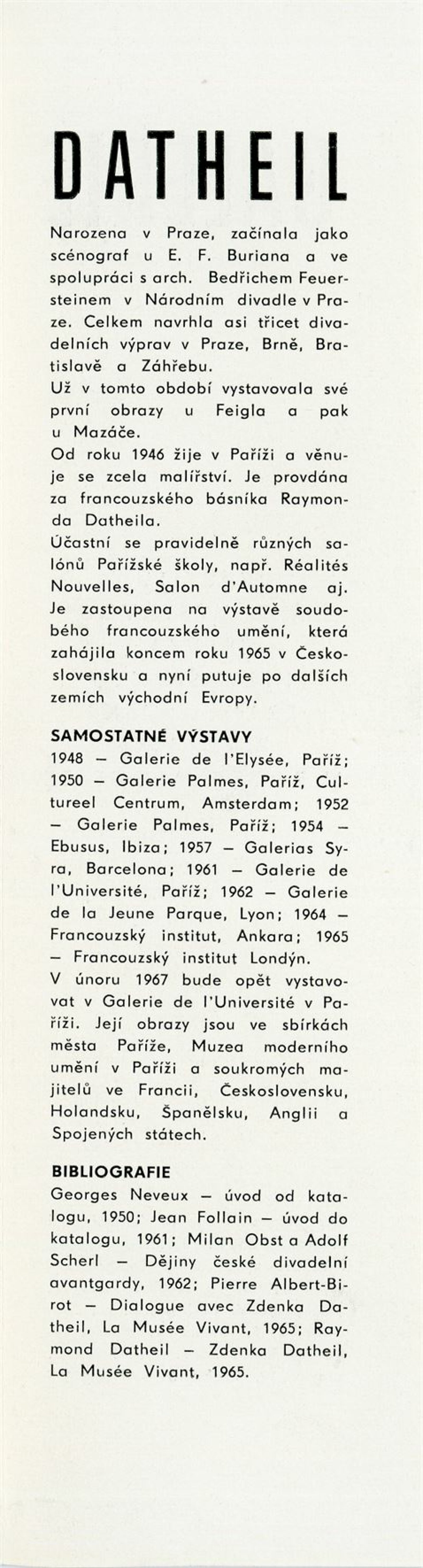 Zdenka Datheilová: Dům umění města Brna, Procházkova síň, 8. 6. – 26. 6. 1966 / Převzatý katalog. Datheil-Paris: Galerie u Řečických, 1966 / Texty: Jean Bouret, Jean Cassou. – Praha: SČSVU, 1966. – 4 s., obr., životopis, bibliografie, DU 461a [spr. 465]. – MG