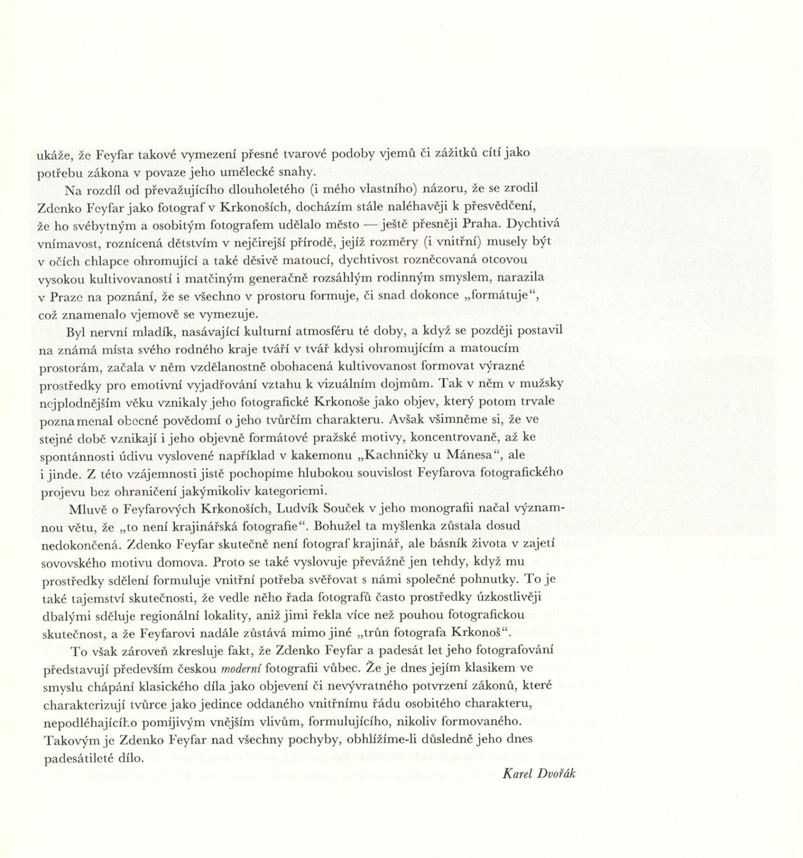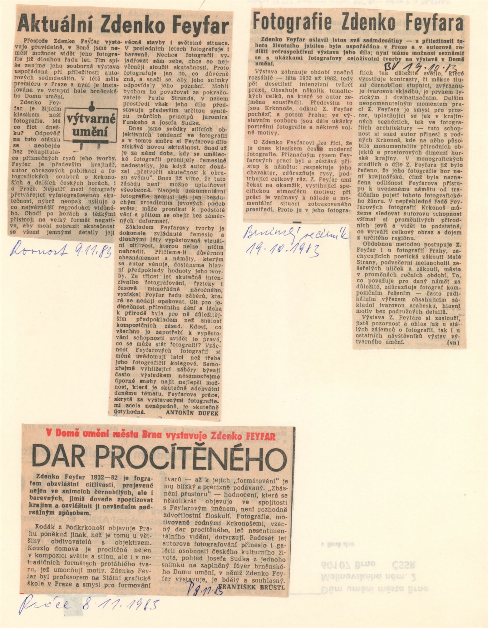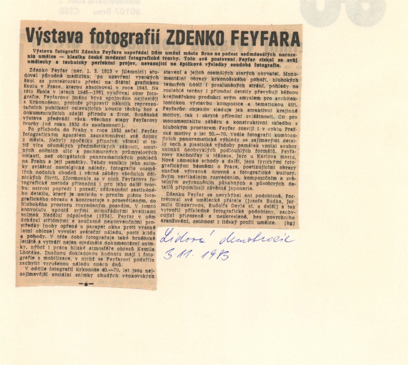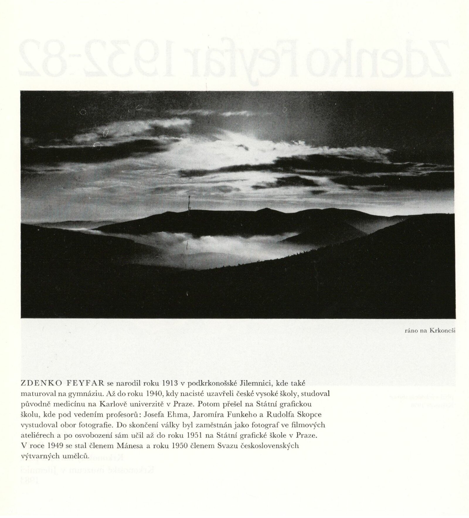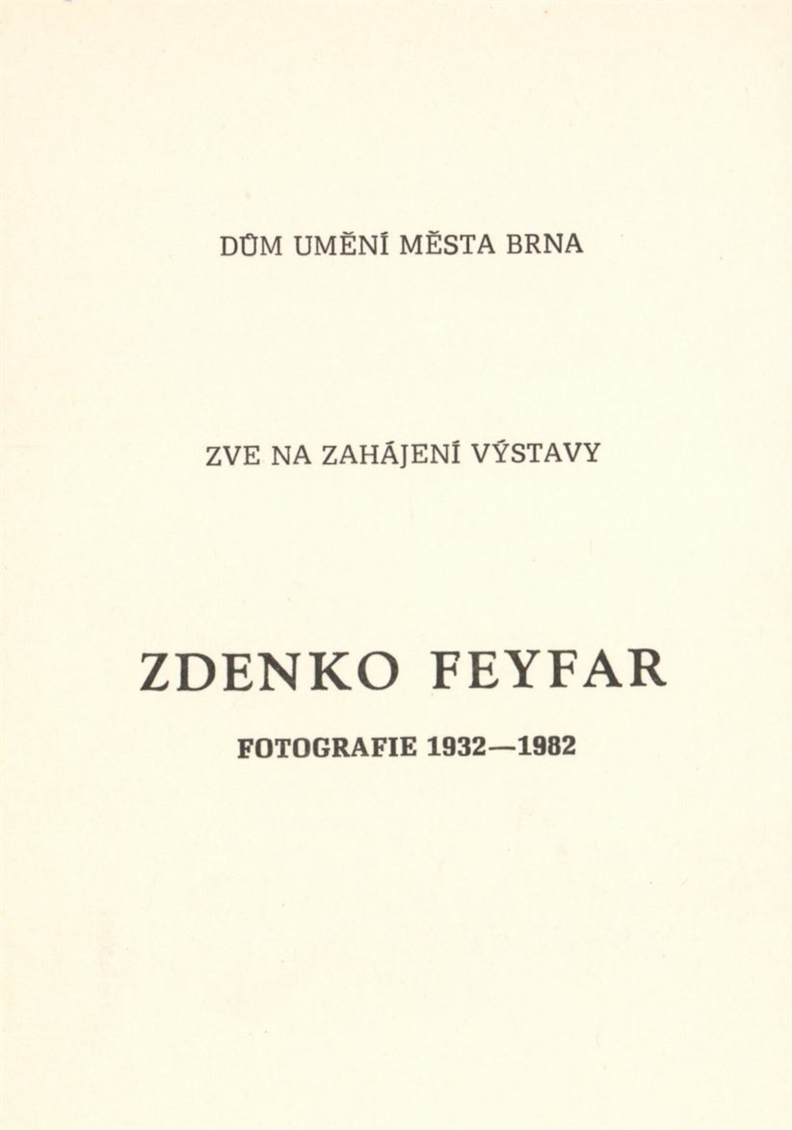 Zdenko Feyfar. Fotografie 1932–1982: Dům umění, hala, 11. 10. – 13. 11. 1983 / Převzatý katalog. Zdenko Feyfar 1932–1982: Galerie d, Praha, červen–červenec 1983 / Text: Karel Dvořák. – Praha: SČVU, 1983. – 16 s., obr., portrét, životopis, výstavy, publikace, DU 768
