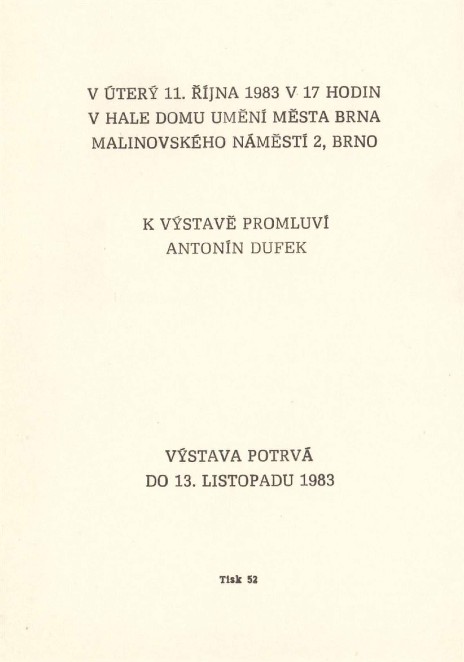 pozvánka, katalog, fotografie pro katalog, seznam počtu fotografií, provozní korespondence (s autorem a s p. Zindulkou), žádost o povolení výstavy, zpráva o služební cestě za účelem převzetí výstavy, potvrzení převzetí výstavy, seznam adresátů k zaslání pozvánek, recenze v tisku