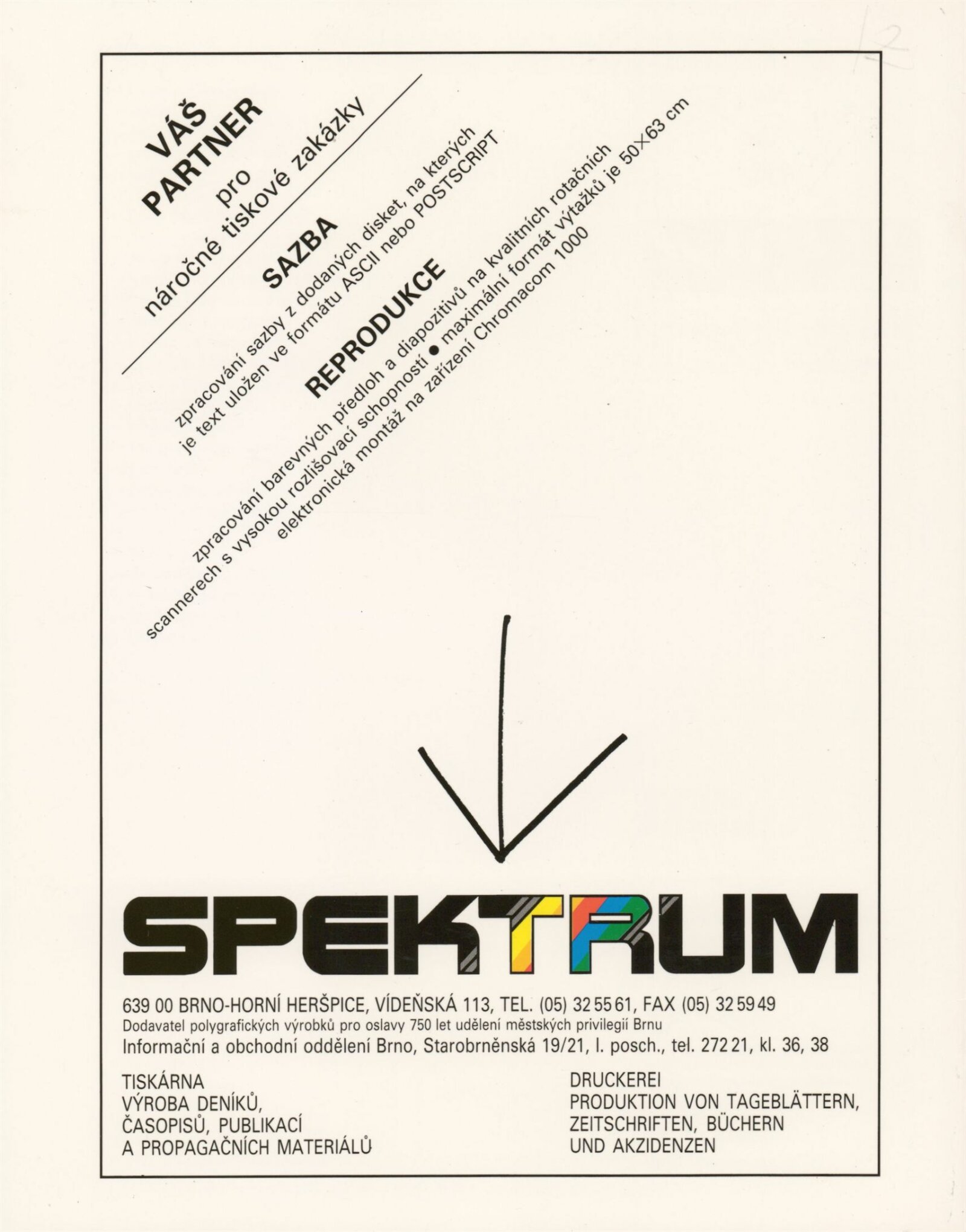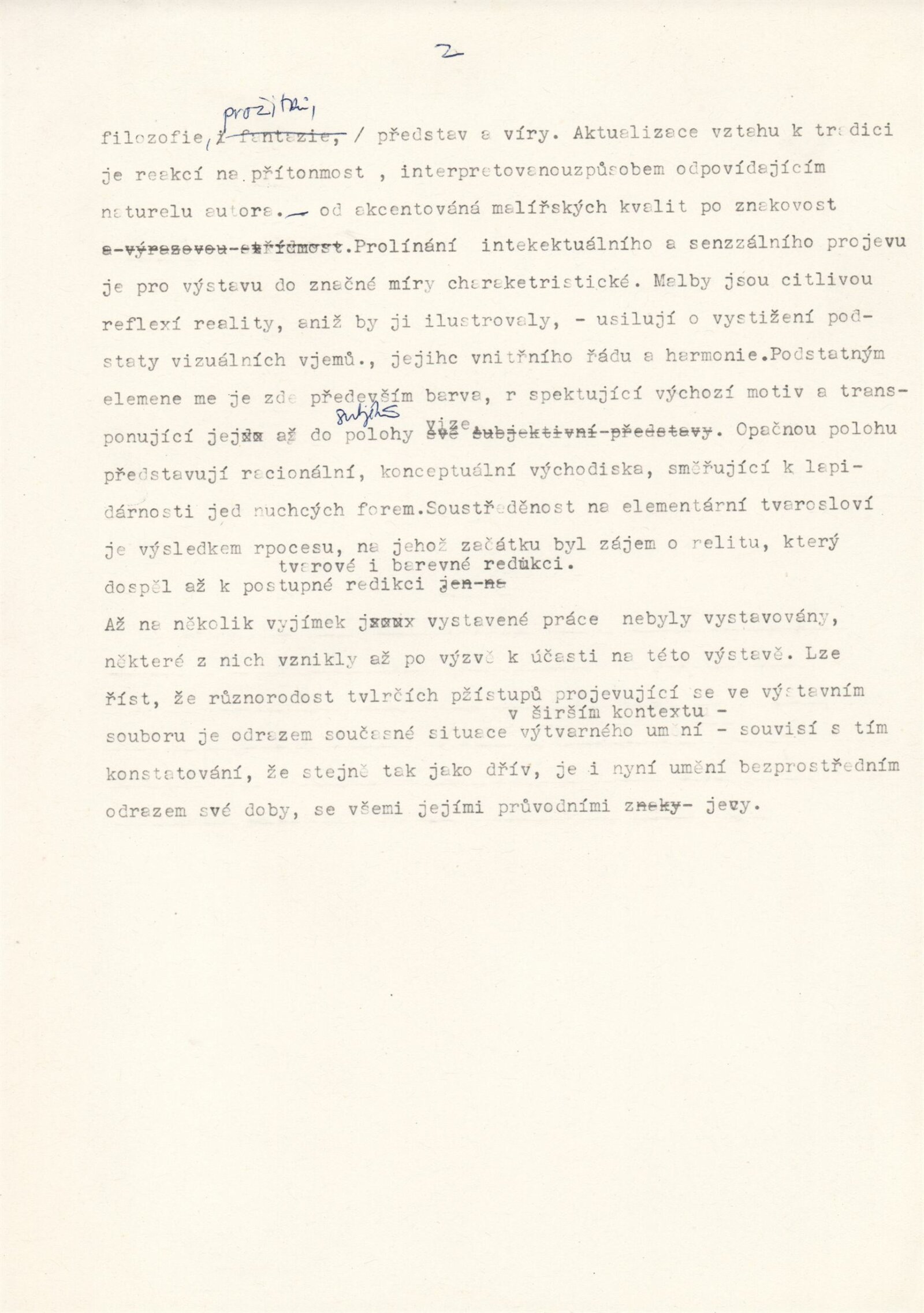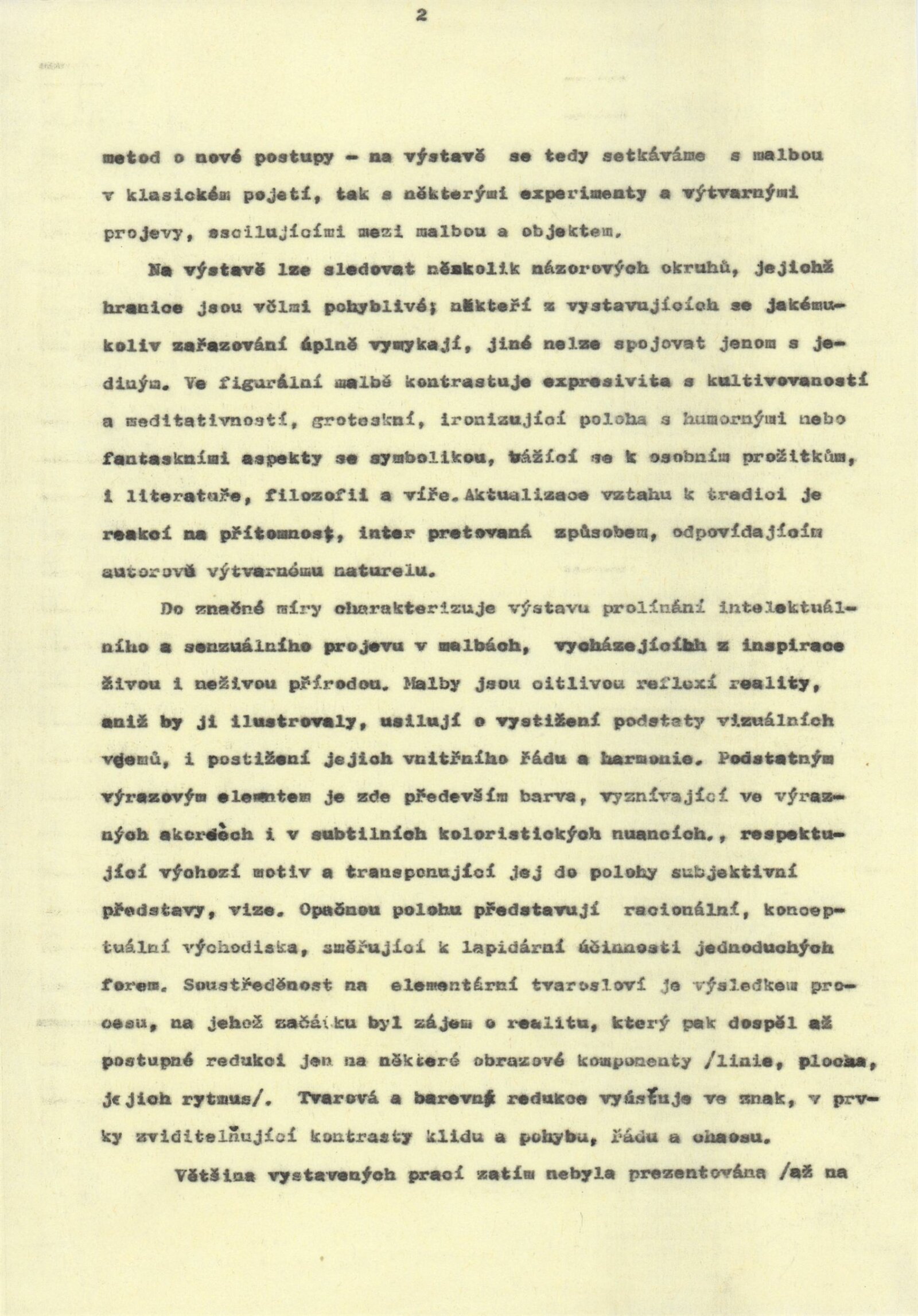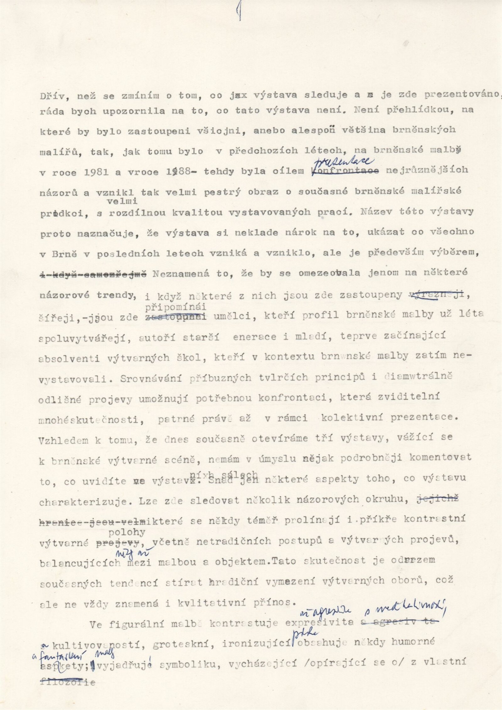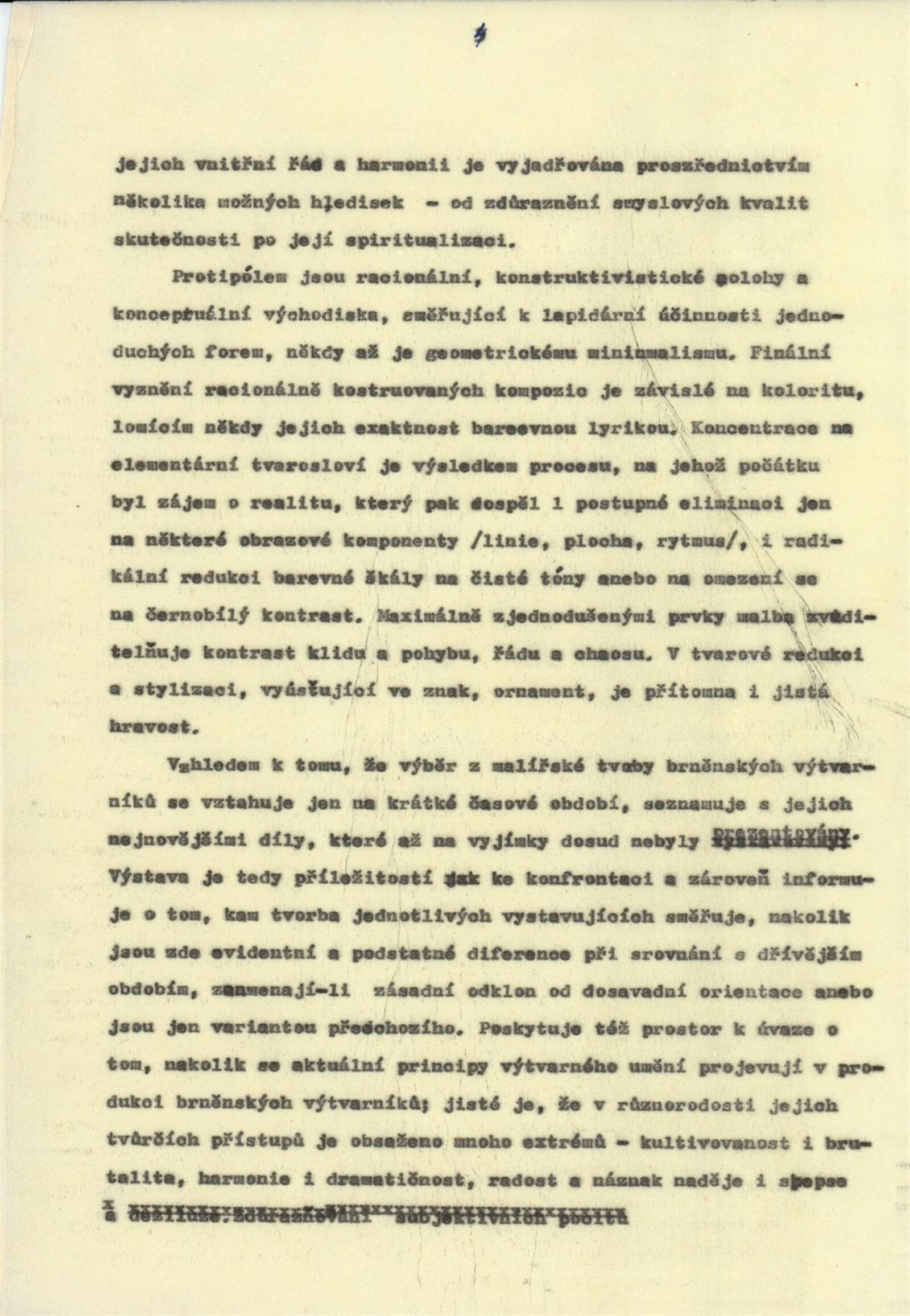 pozvánka, katalog, pozvánka na tiskovou konferenci, anotace, zprávy pro média, úvodní řeč, texty katalog (Vránová), maketa katalogu, podklady pro grafika, fotografie instalace výstavy, seznam vystavujících, přihlášky vybraných umělců, ukázky jejich tvorby, korespondence (J. Vránová a vybraní umělci, zařazení výstavy do oslav 750. výročí udělení městských privilegií Brnu), reversy, recenze v tisku, katalogy z dřívějších výstav vybraných umělců