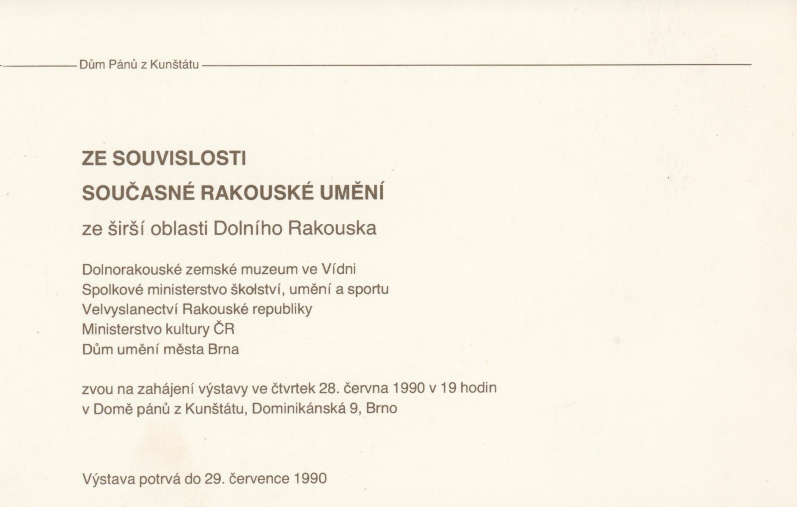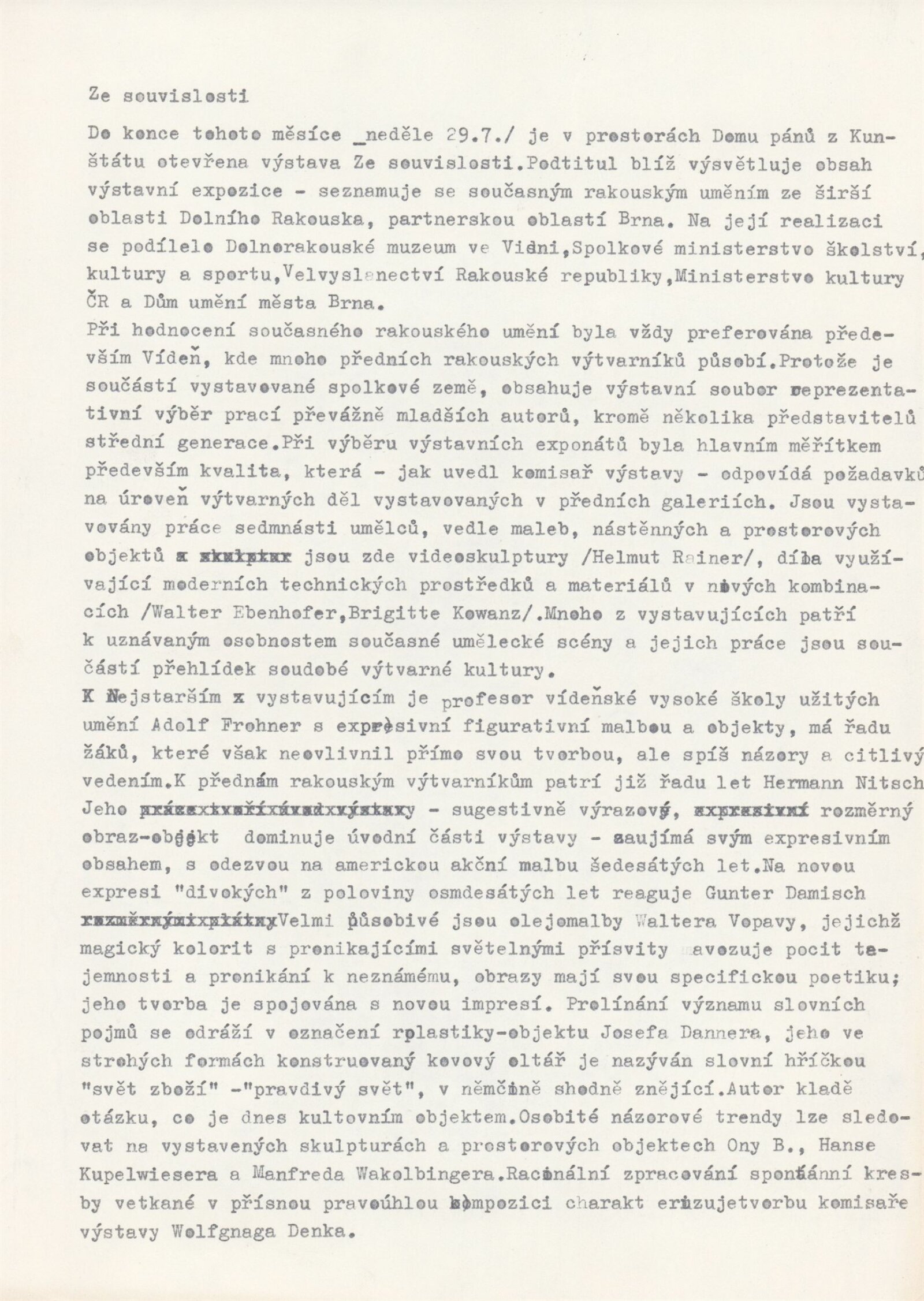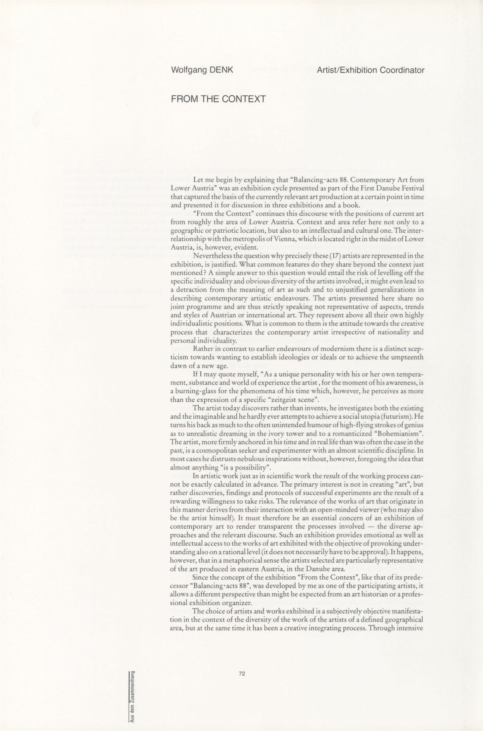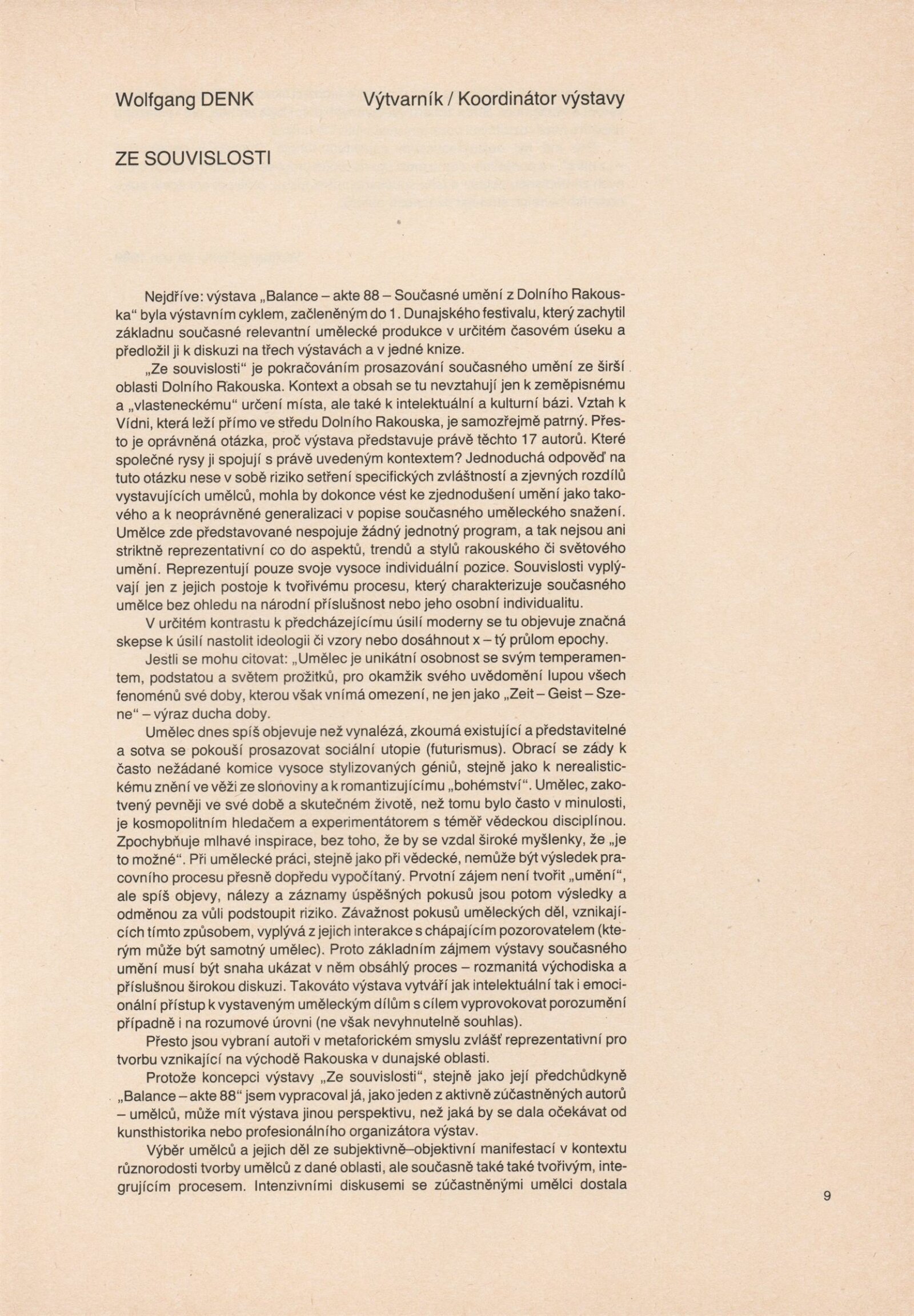 Ze souvislosti. Současné rakouské umění ze širší oblasti Dolního Rakouska: Dům umění města Brna / Dům pánů z Kunštátu, Kabinet grafiky, 1. patro, 28. 6. – 29. 7. 1990 / Společný katalog Aus dem Zusammenhang. 40 Arbeiten aktueller Kunst aus dem erweiterten Umfelt Niederösterreich Balance-akte 88. Texty Liese Prokop, Dieter Ronte, Wolfgang Denk, Peter Zawrel. – Wien, NO Landesregierung, 2.Aufl. – 80 s., obr., jako vložka český překlad textů [10] s., DPK 940. – MZK