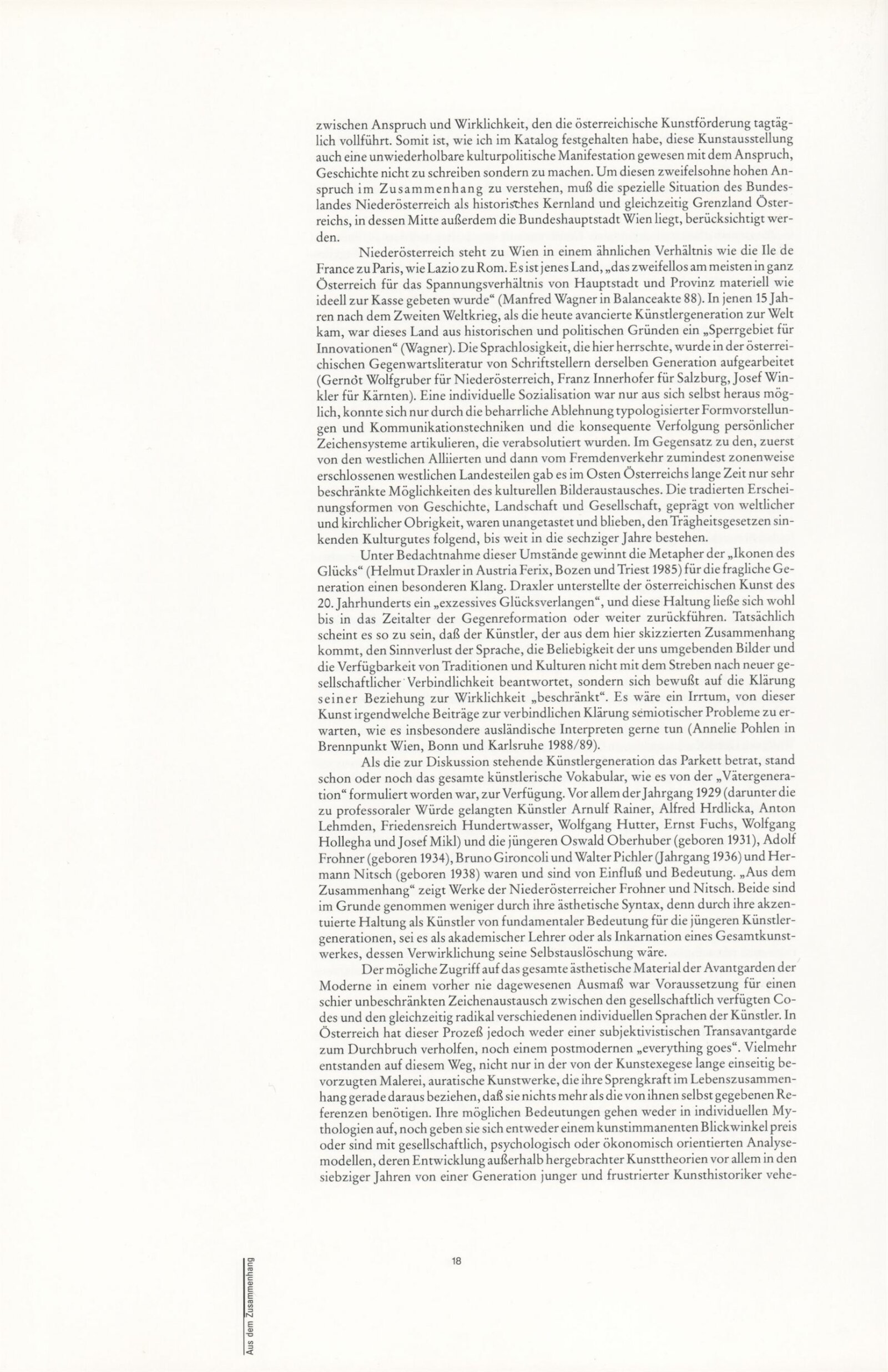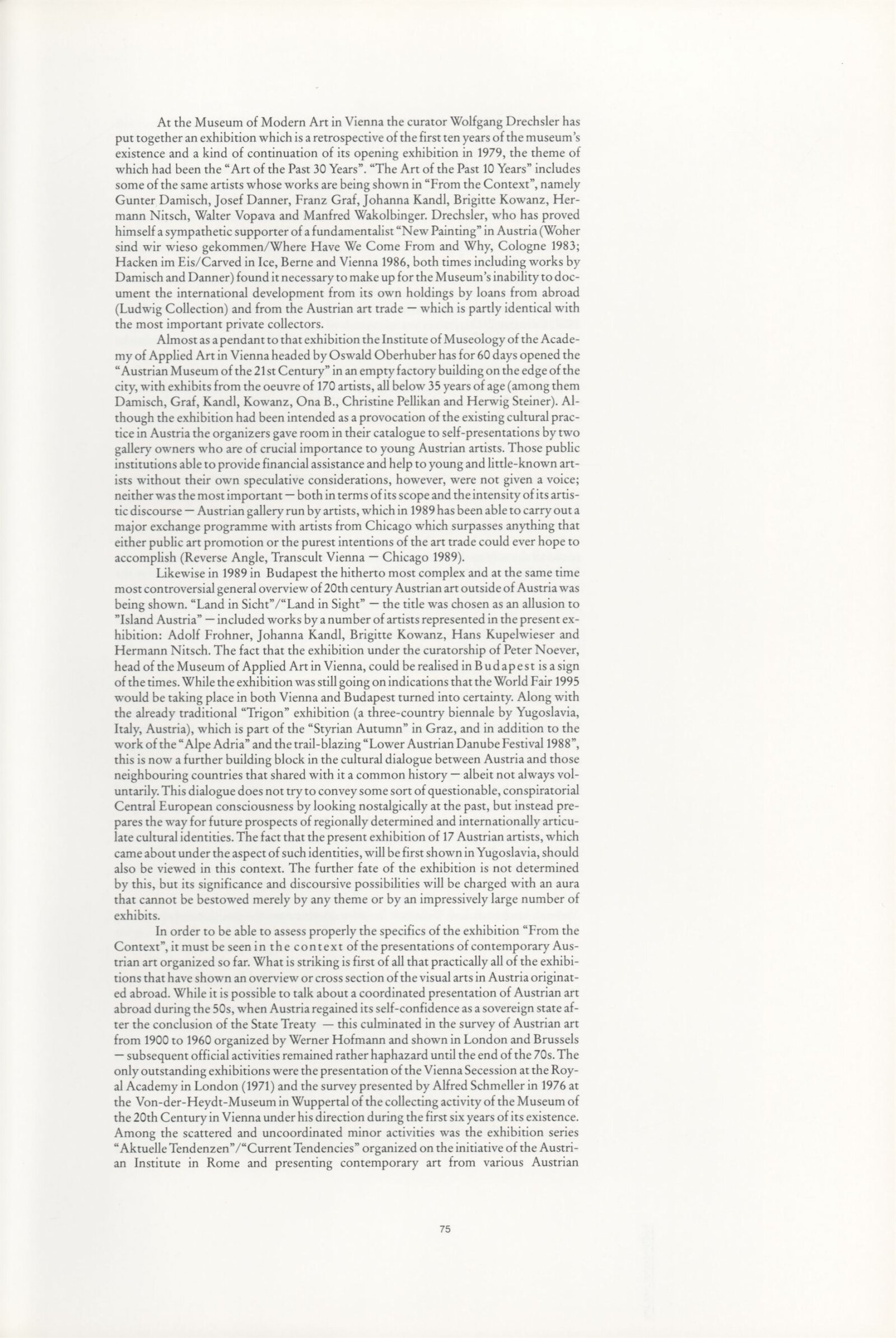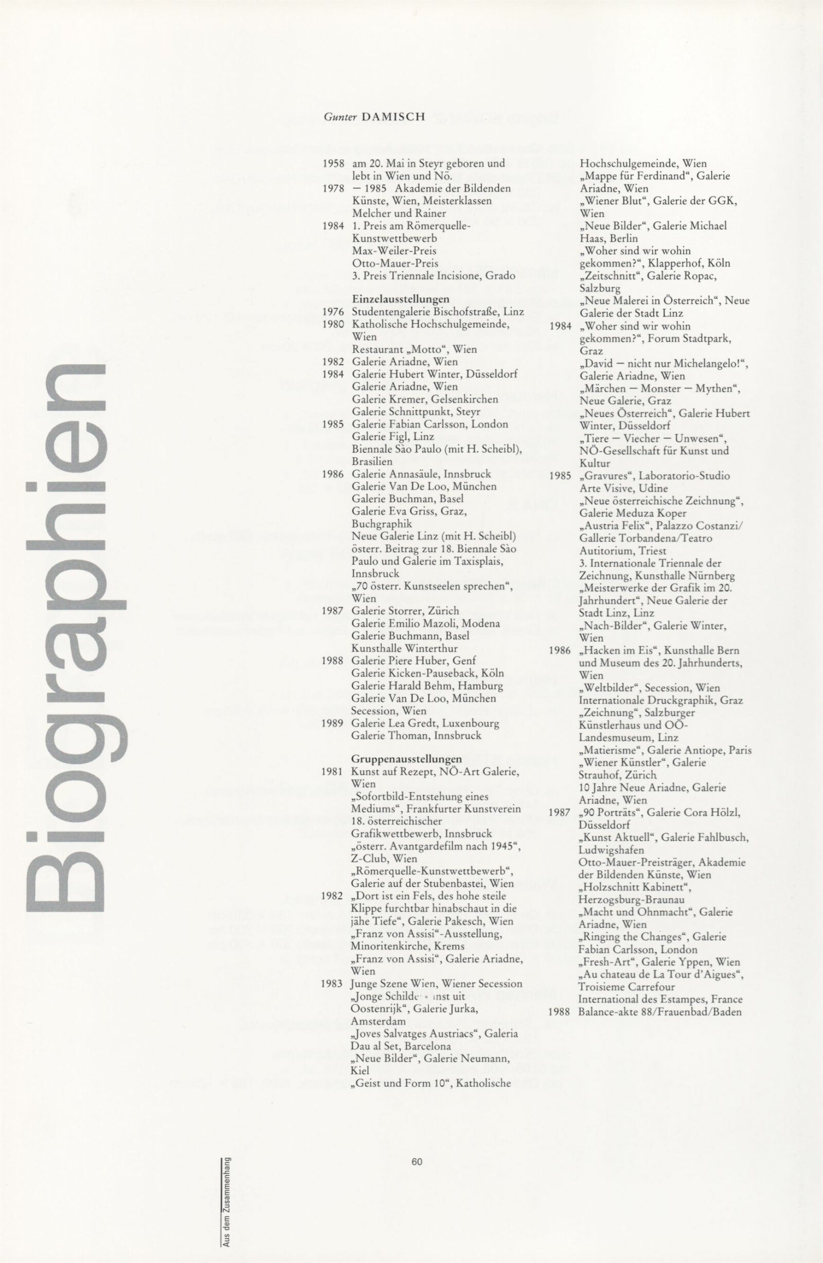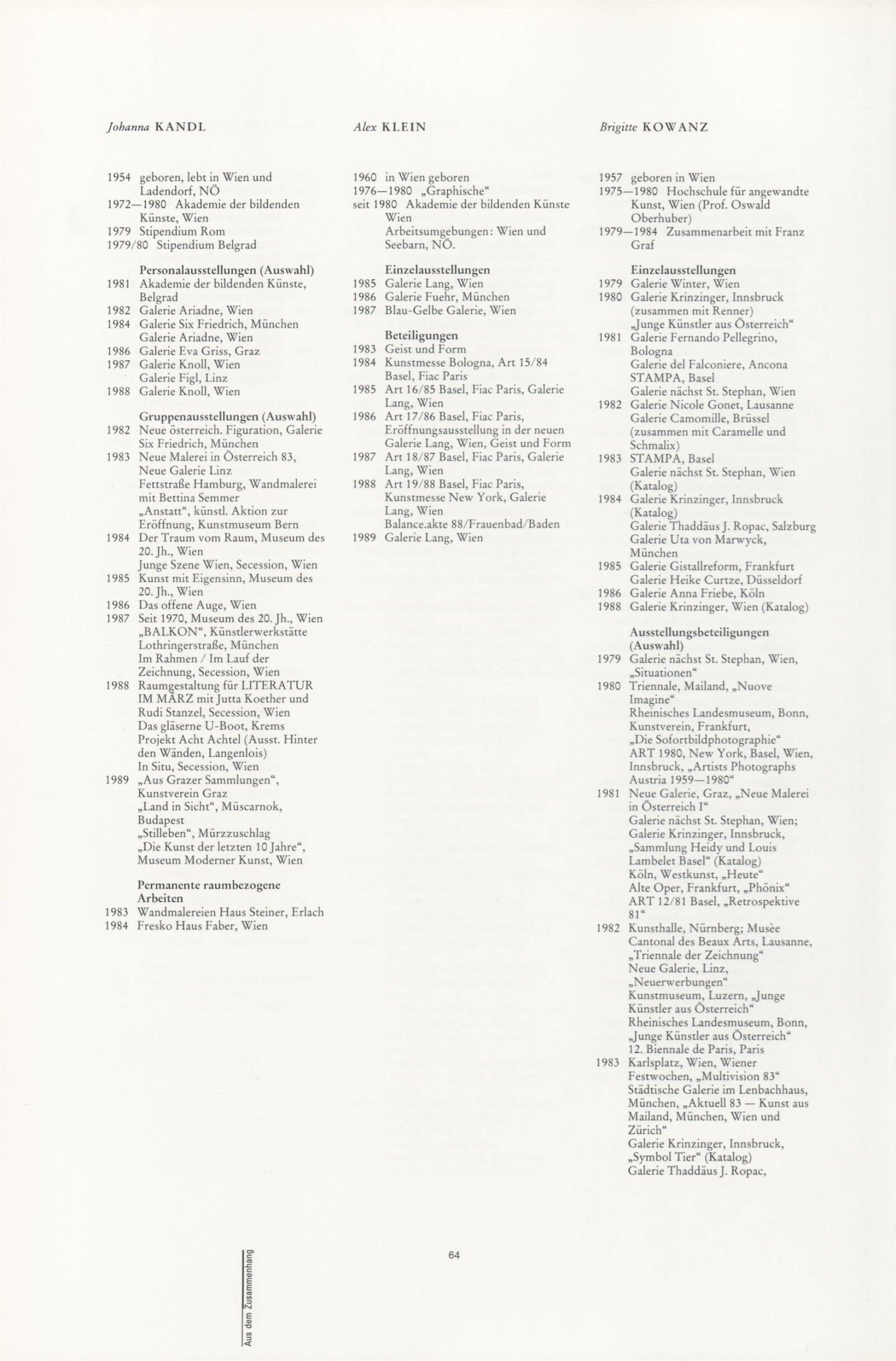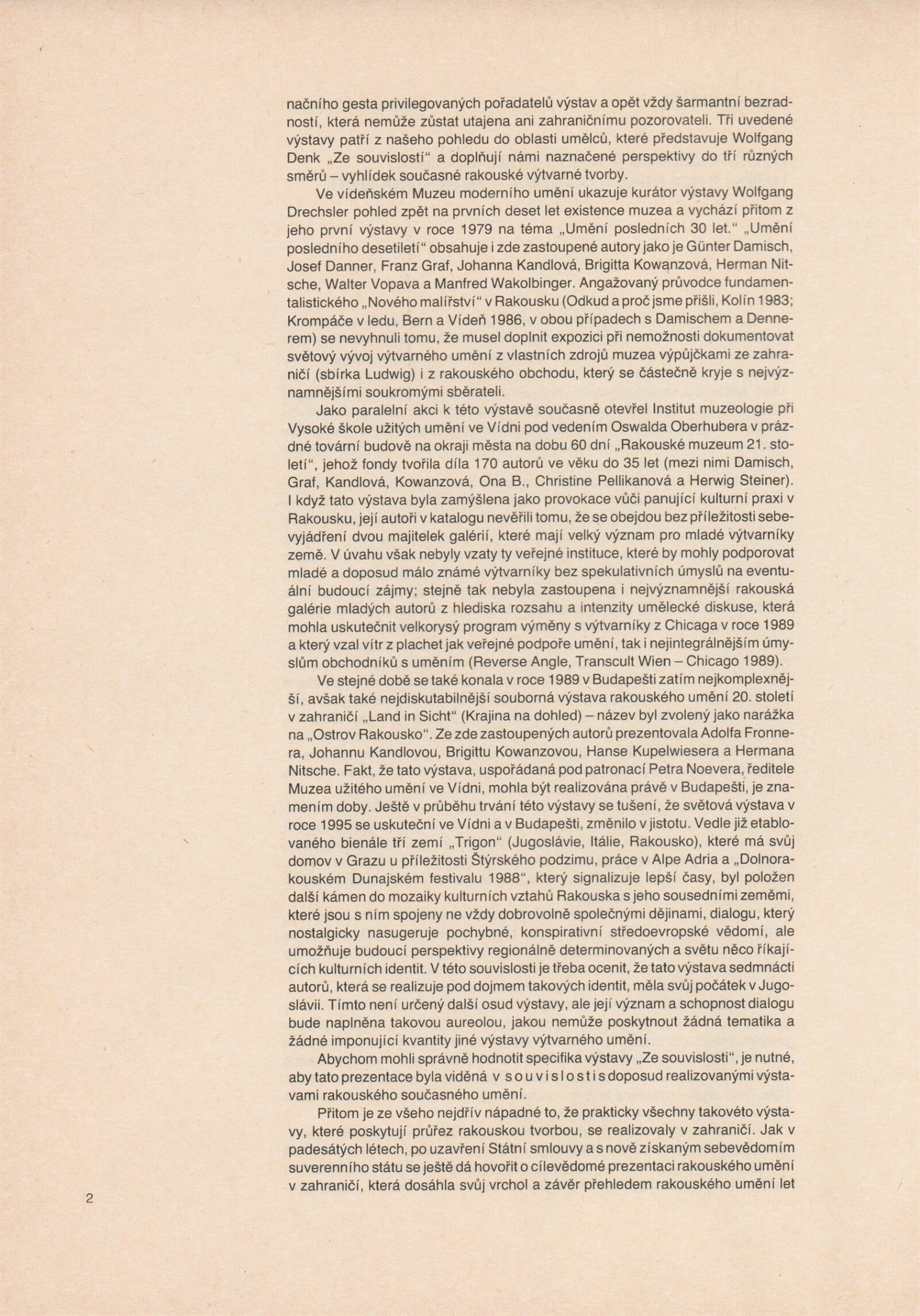 Ze souvislosti. Současné rakouské umění ze širší oblasti Dolního Rakouska: Dům umění města Brna / Dům pánů z Kunštátu, Kabinet grafiky, 1. patro, 28. 6. – 29. 7. 1990 / Společný katalog Aus dem Zusammenhang. 40 Arbeiten aktueller Kunst aus dem erweiterten Umfelt Niederösterreich Balance-akte 88. Texty Liese Prokop, Dieter Ronte, Wolfgang Denk, Peter Zawrel. – Wien, NO Landesregierung, 2.Aufl. – 80 s., obr., jako vložka český překlad textů [10] s., DPK 940. – MZK