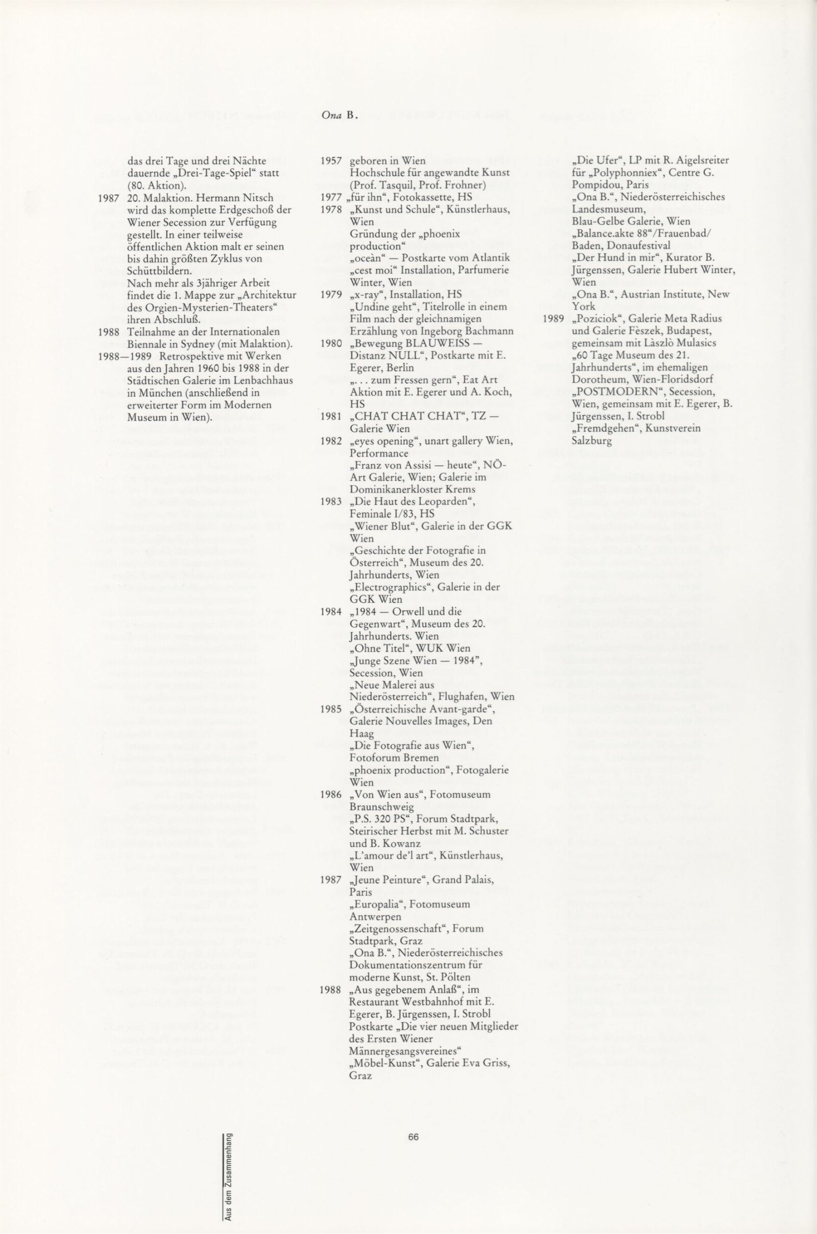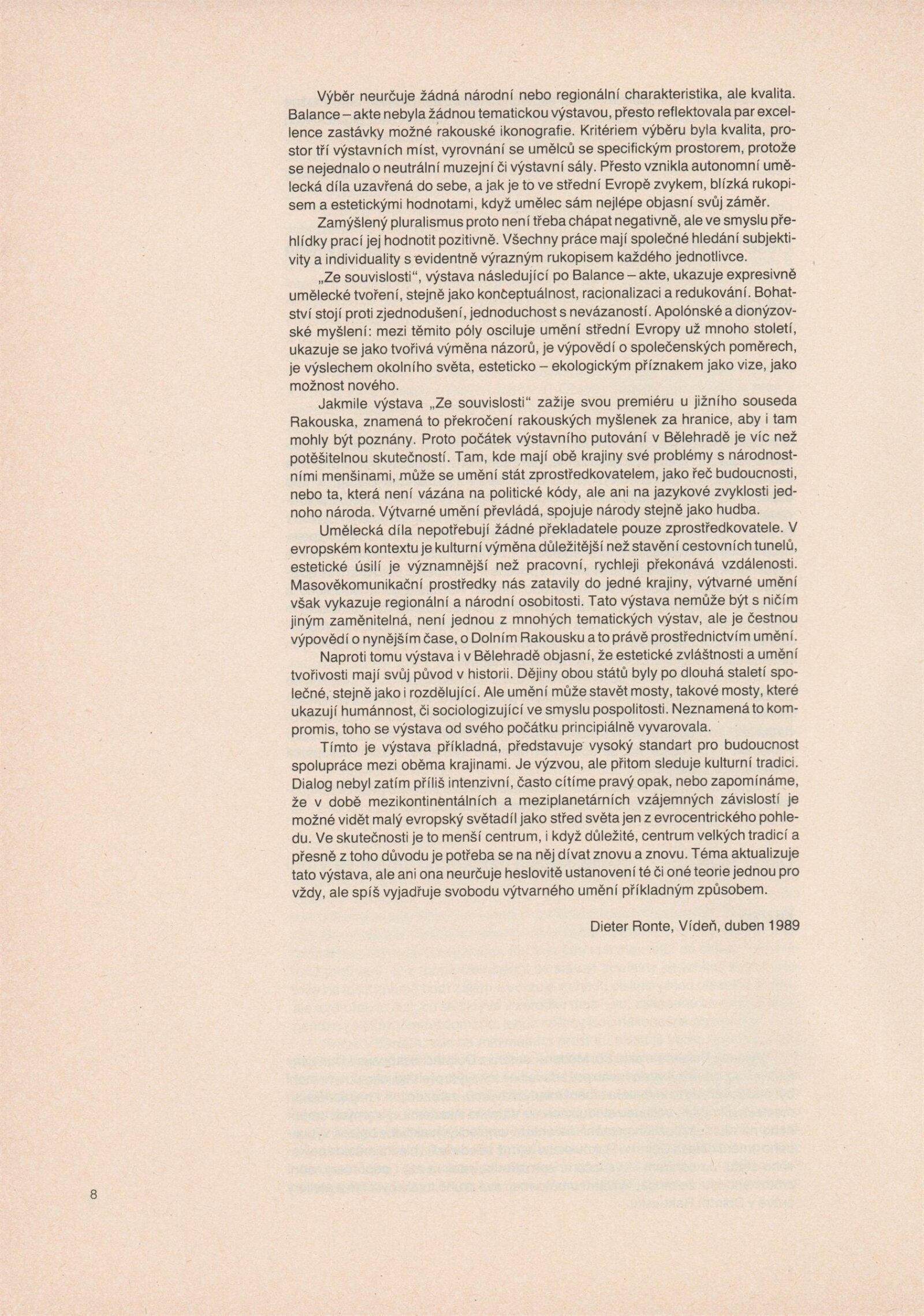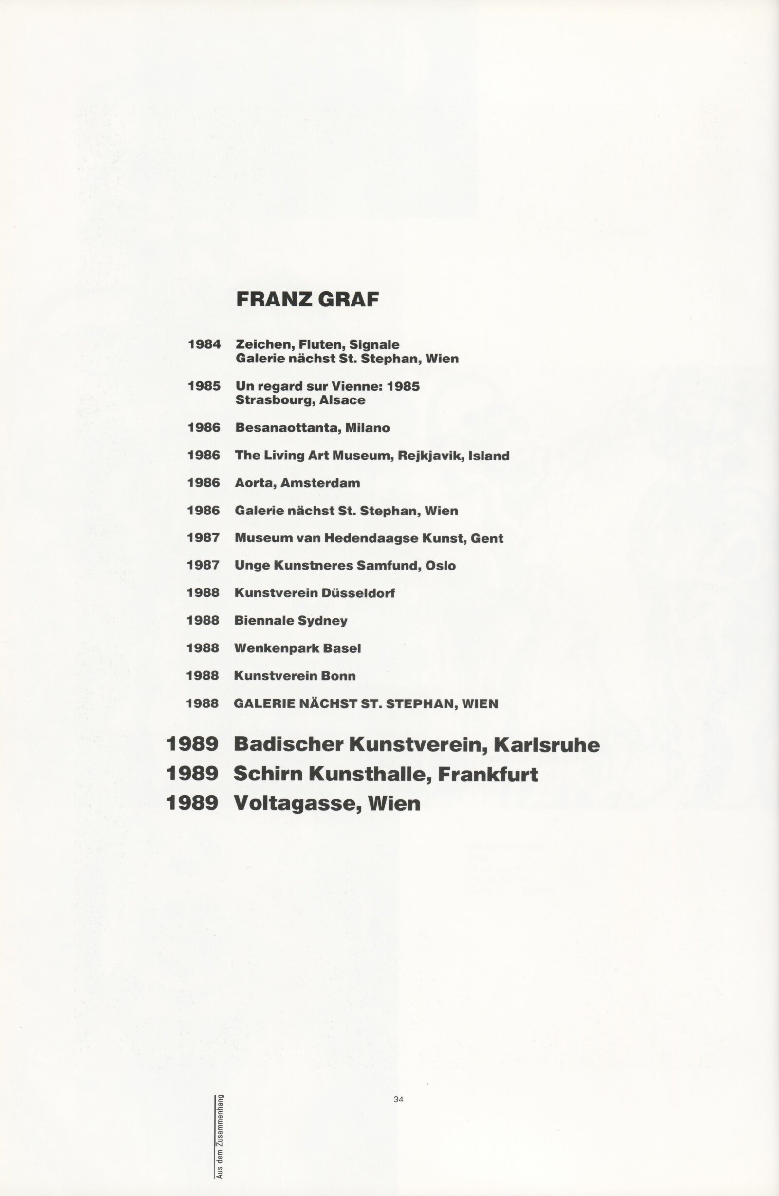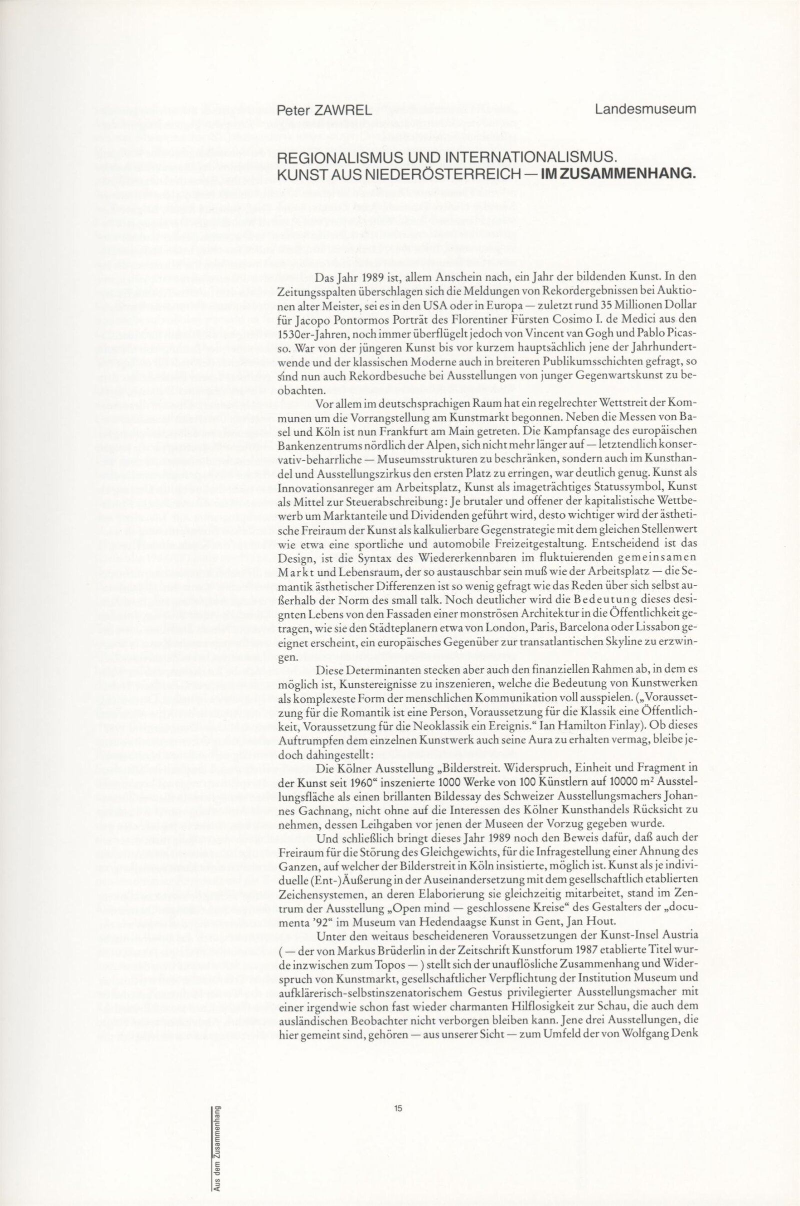 Ze souvislosti. Současné rakouské umění ze širší oblasti Dolního Rakouska: Dům umění města Brna / Dům pánů z Kunštátu, Kabinet grafiky, 1. patro, 28. 6. – 29. 7. 1990 / Společný katalog Aus dem Zusammenhang. 40 Arbeiten aktueller Kunst aus dem erweiterten Umfelt Niederösterreich Balance-akte 88. Texty Liese Prokop, Dieter Ronte, Wolfgang Denk, Peter Zawrel. – Wien, NO Landesregierung, 2.Aufl. – 80 s., obr., jako vložka český překlad textů [10] s., DPK 940. – MZK