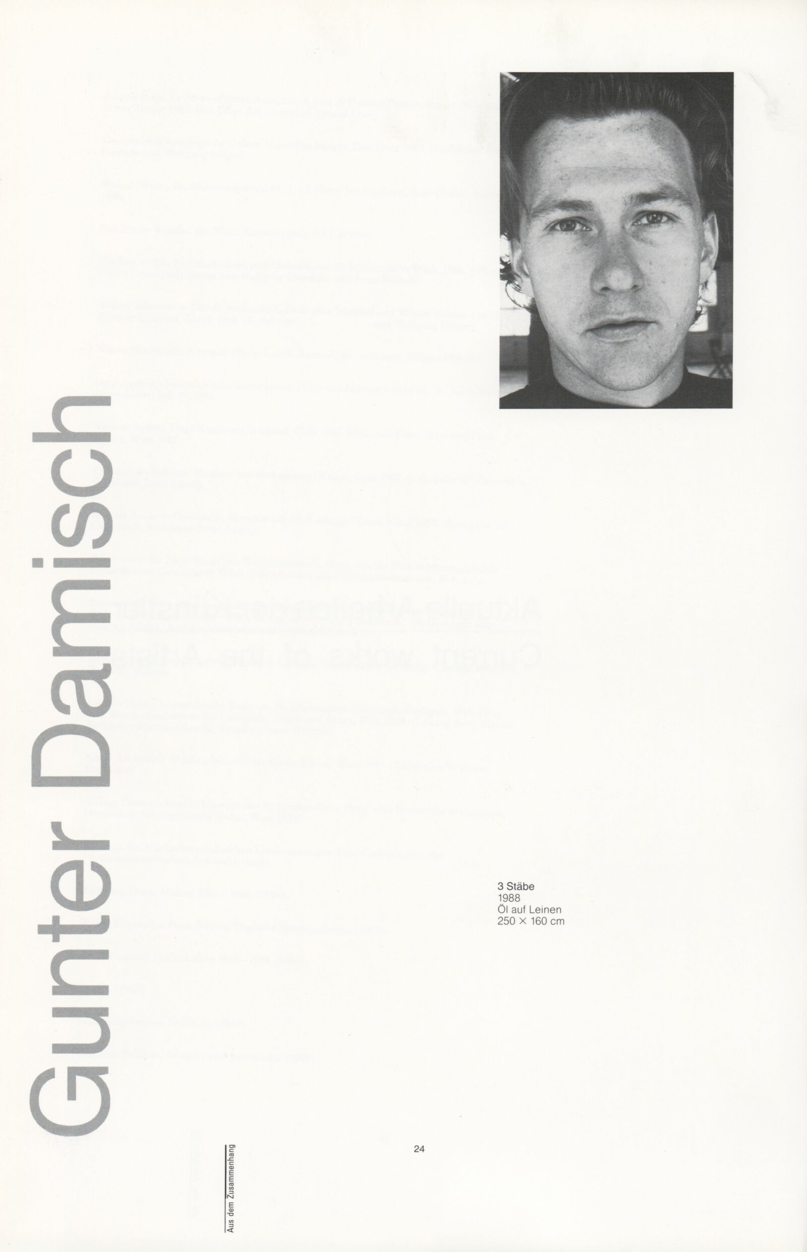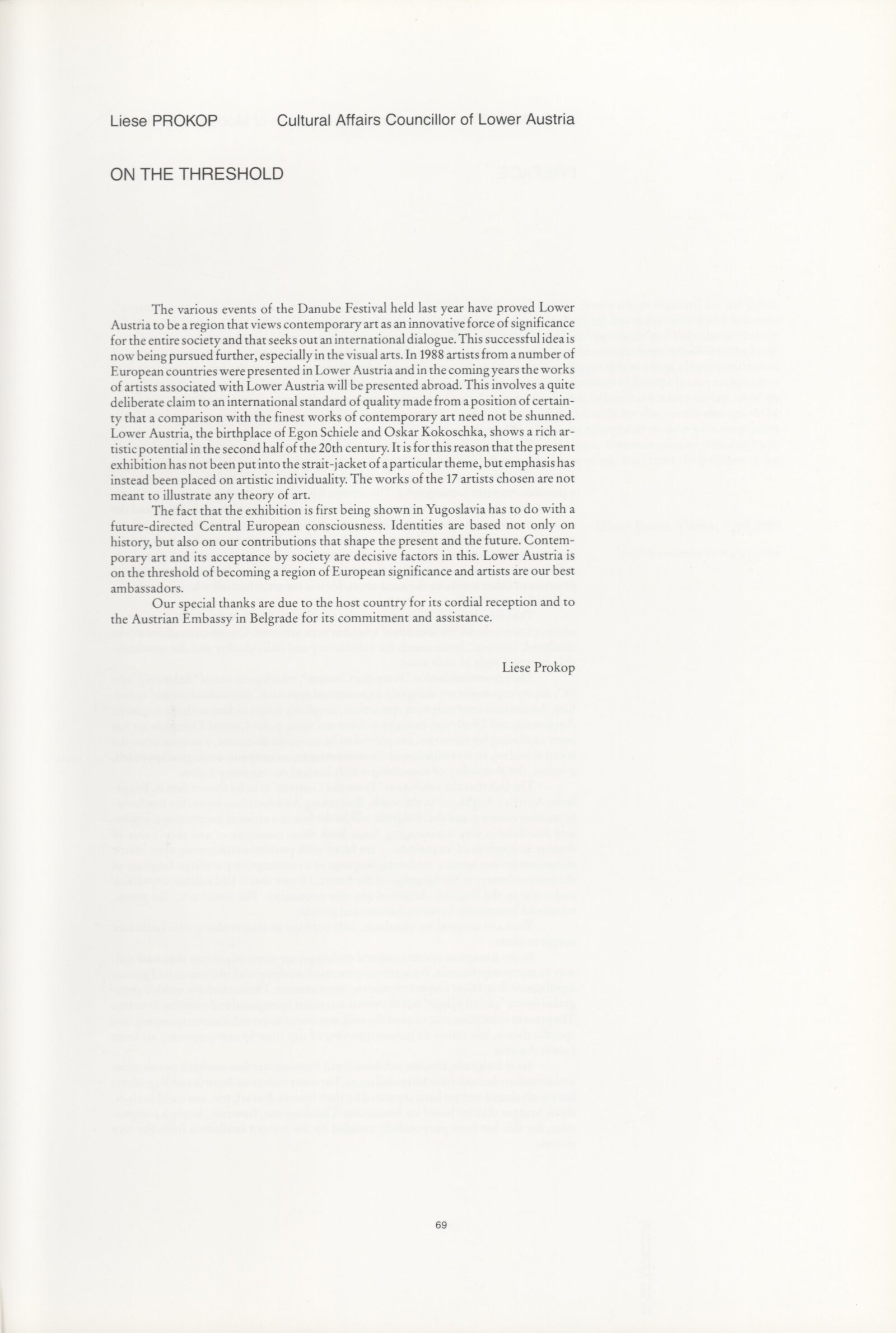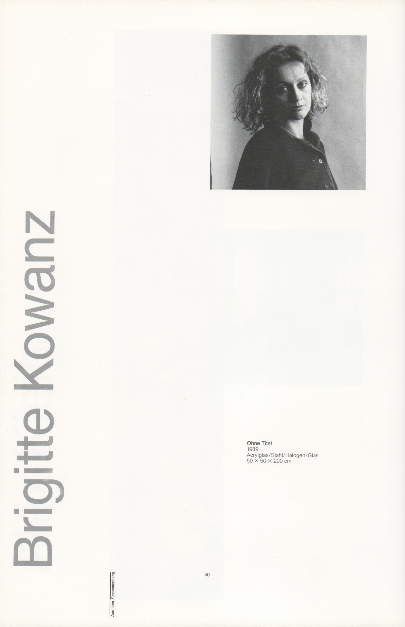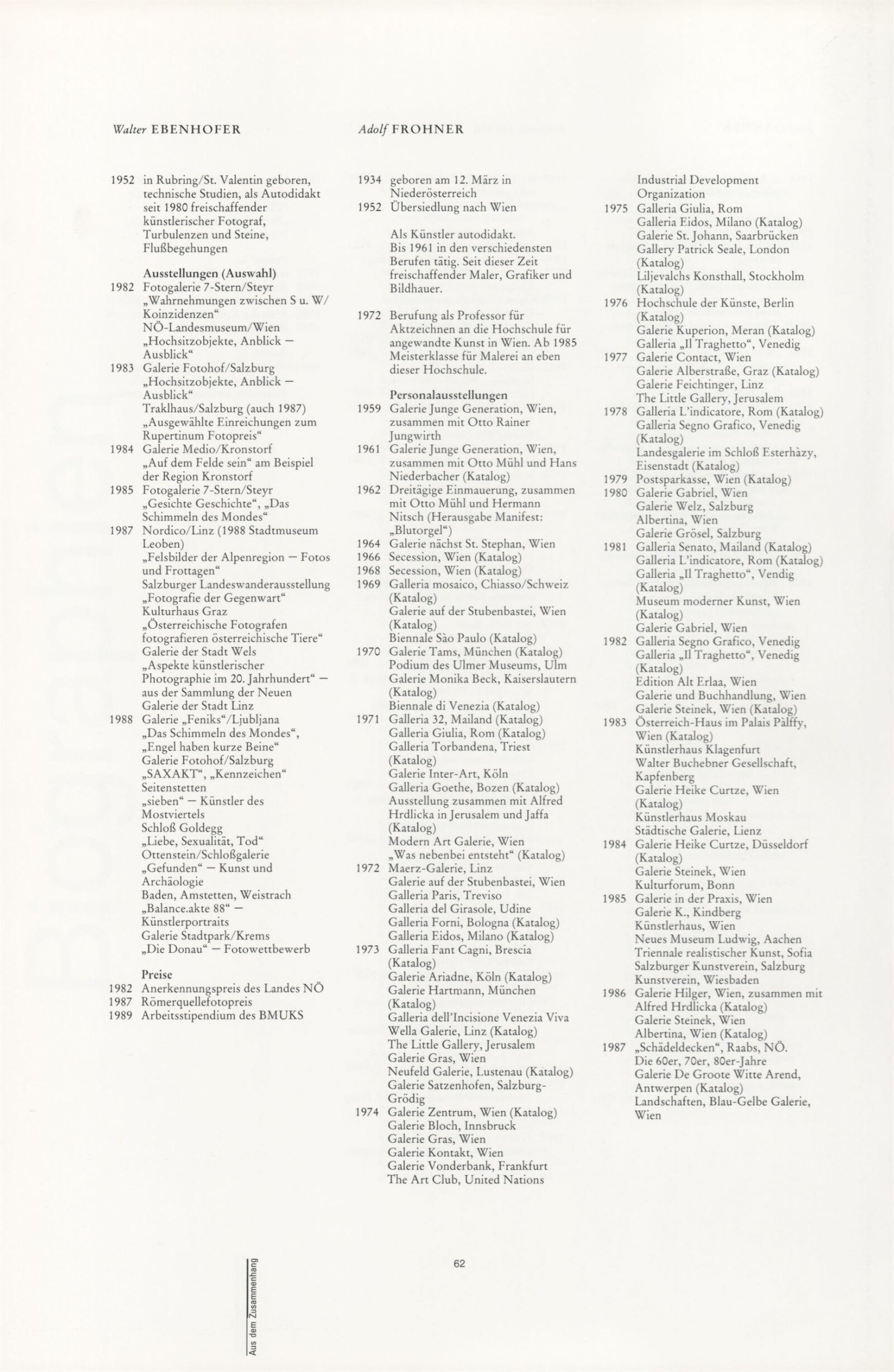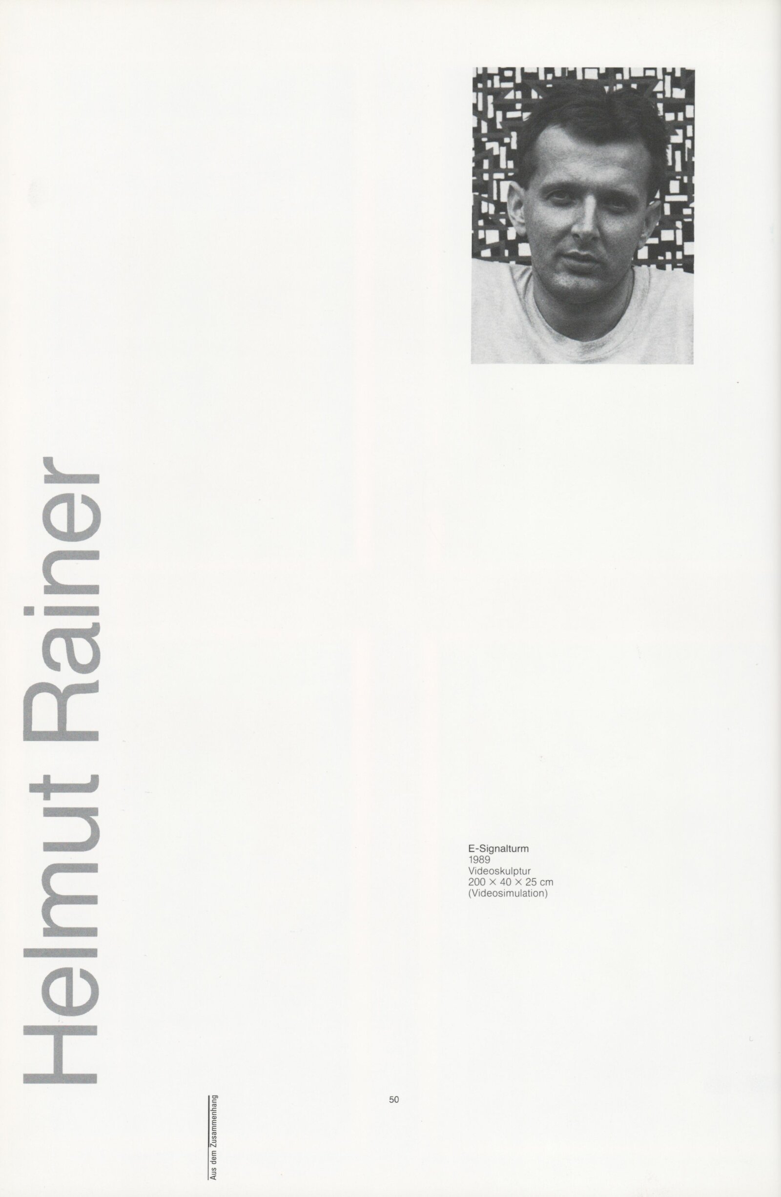 Ze souvislosti. Současné rakouské umění ze širší oblasti Dolního Rakouska: Dům umění města Brna / Dům pánů z Kunštátu, Kabinet grafiky, 1. patro, 28. 6. – 29. 7. 1990 / Společný katalog Aus dem Zusammenhang. 40 Arbeiten aktueller Kunst aus dem erweiterten Umfelt Niederösterreich Balance-akte 88. Texty Liese Prokop, Dieter Ronte, Wolfgang Denk, Peter Zawrel. – Wien, NO Landesregierung, 2.Aufl. – 80 s., obr., jako vložka český překlad textů [10] s., DPK 940. – MZK