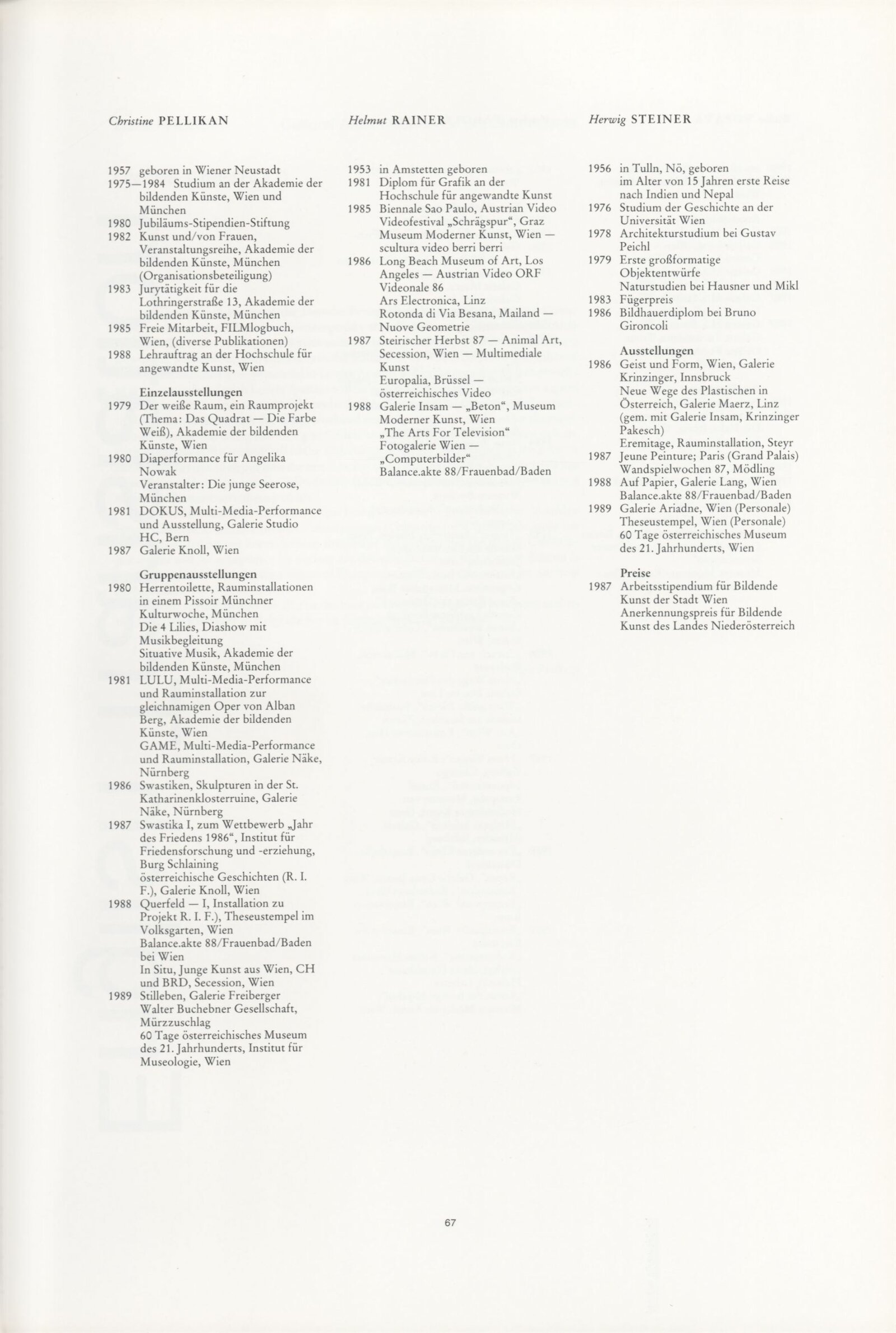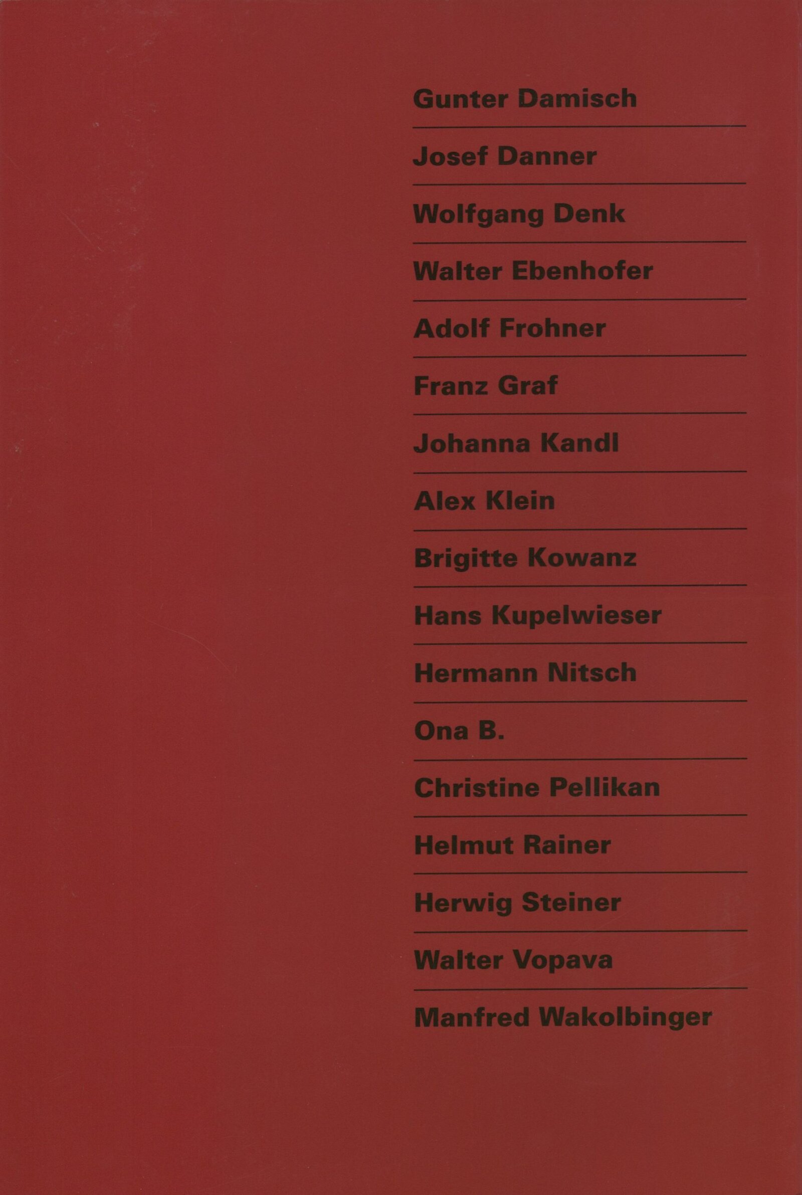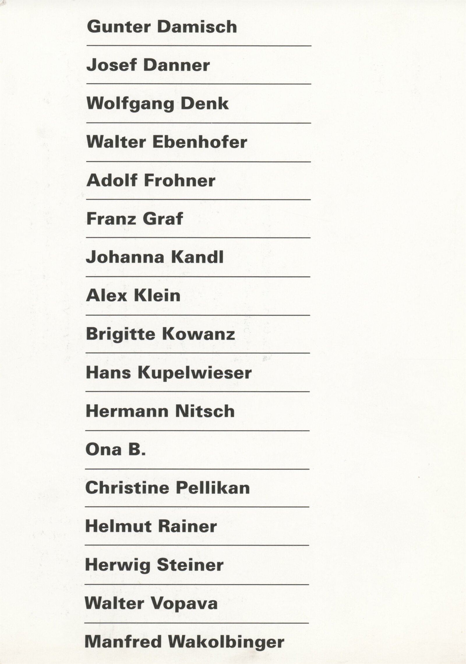 Gunter Damisch, Josef Danner, Wolfgang Denk, Walter Ebenhofer, Adolf Frohner, Franz Graf, Johanna Kandl, Alex Klein, Brigitte Kowanz, Hans Kupelwieser, Hermann Nitsch, Ona B., Christine Pellikan, Helmut Rainer, Herwing Steiner, Walter Vopava, Manfred Wakolbinger