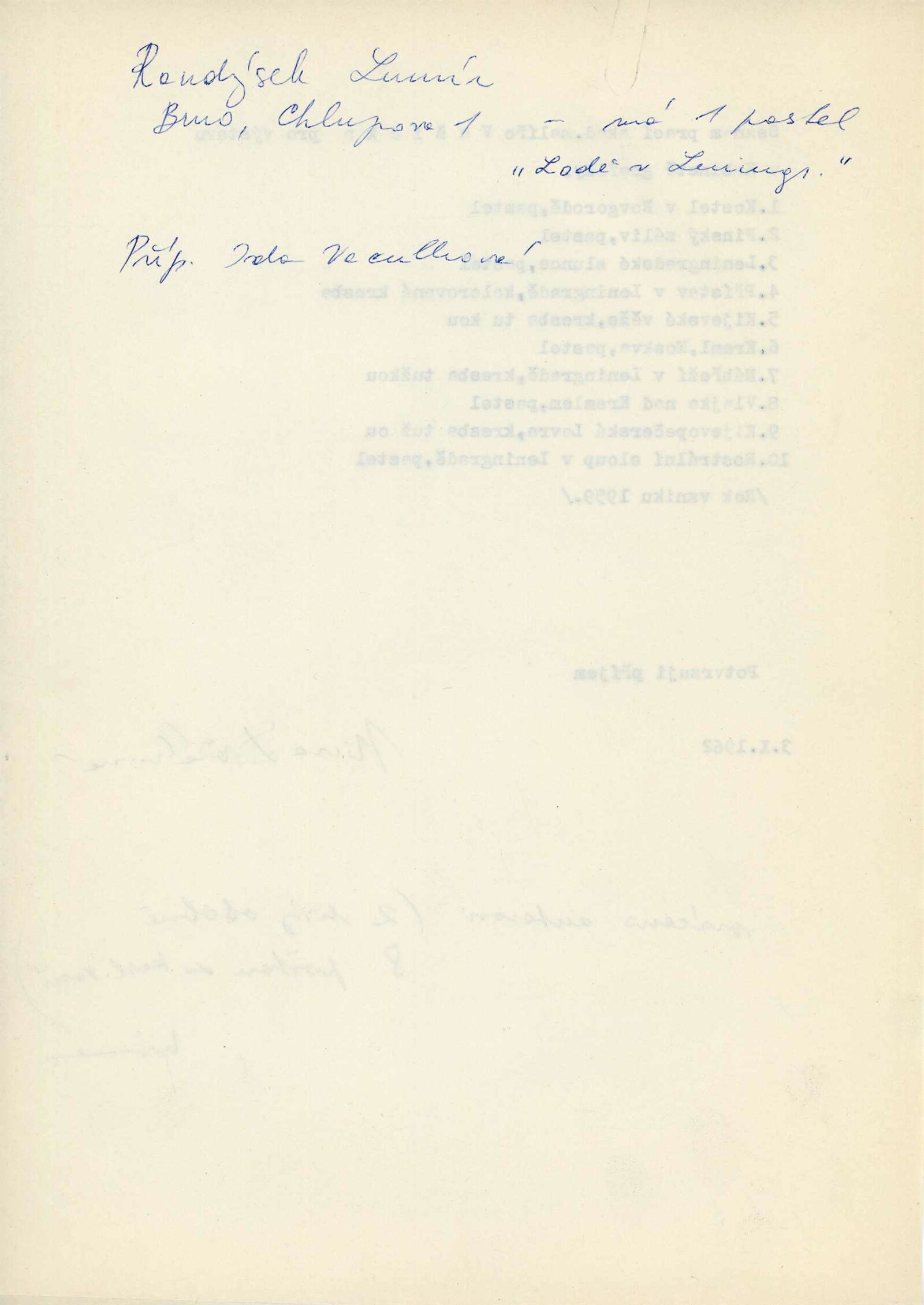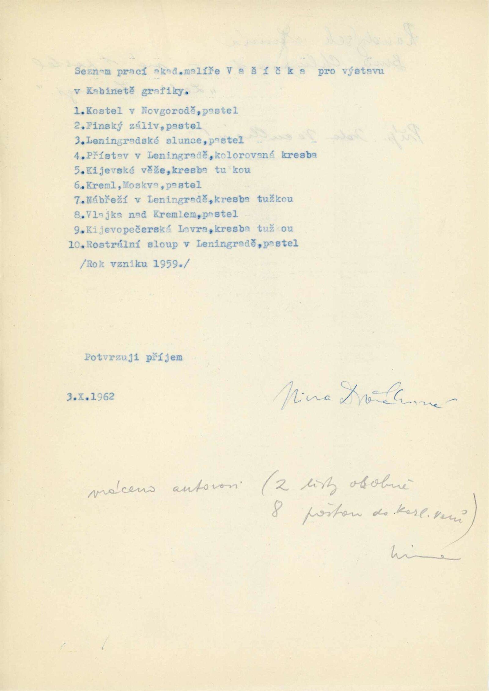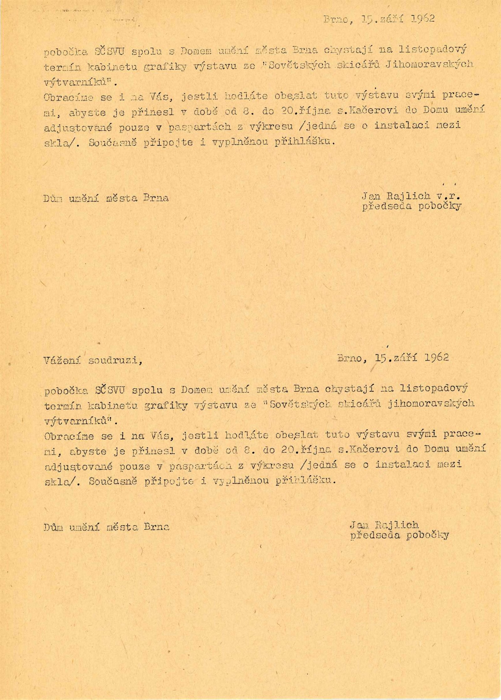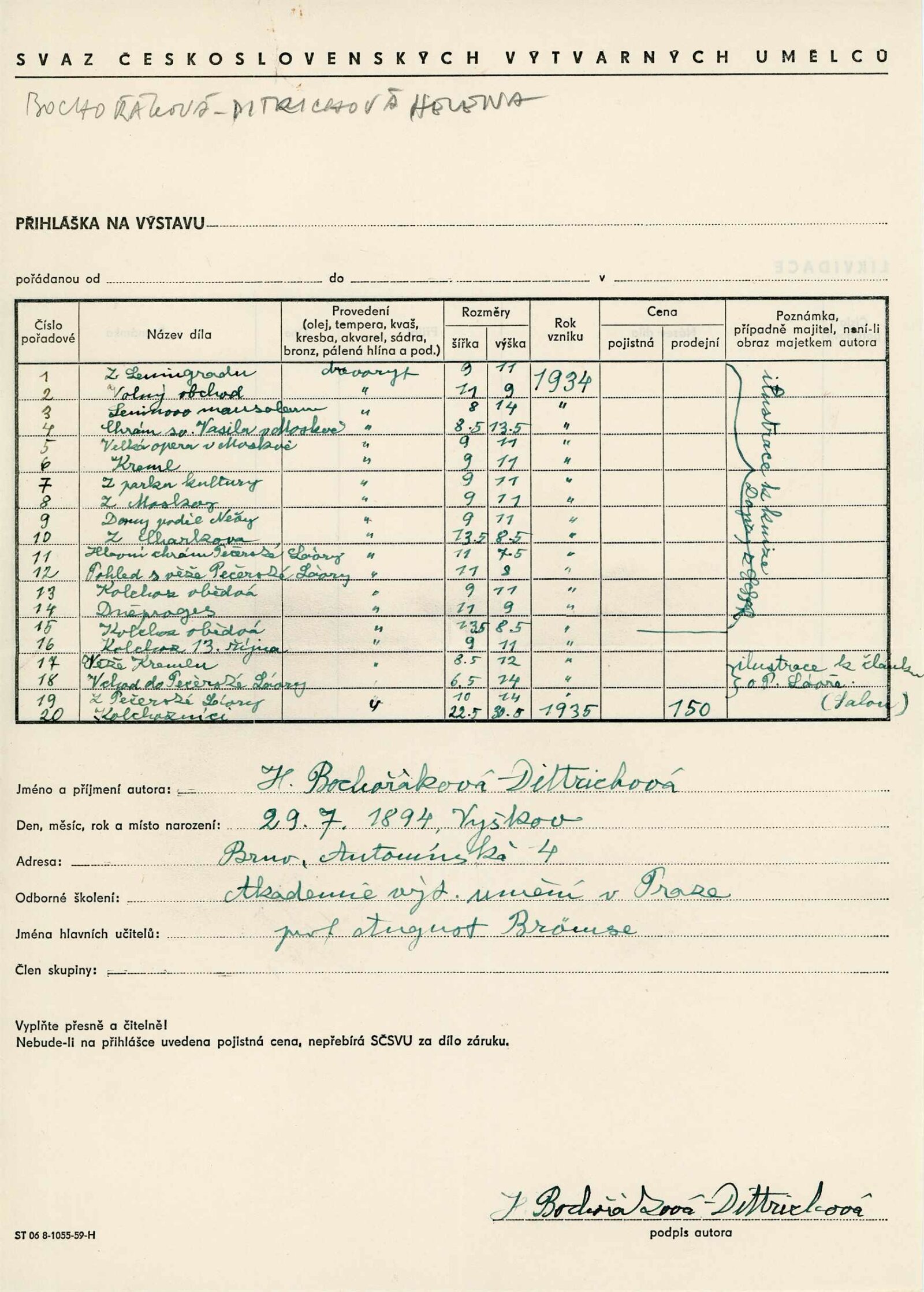 přihláška na výstavu (Helena Bochořáková-Dittrichová), seznam vystavených děl, předtištěné žádosti o poskytnutí prací na výstavu (Jan Rajlich), recenze v tisku