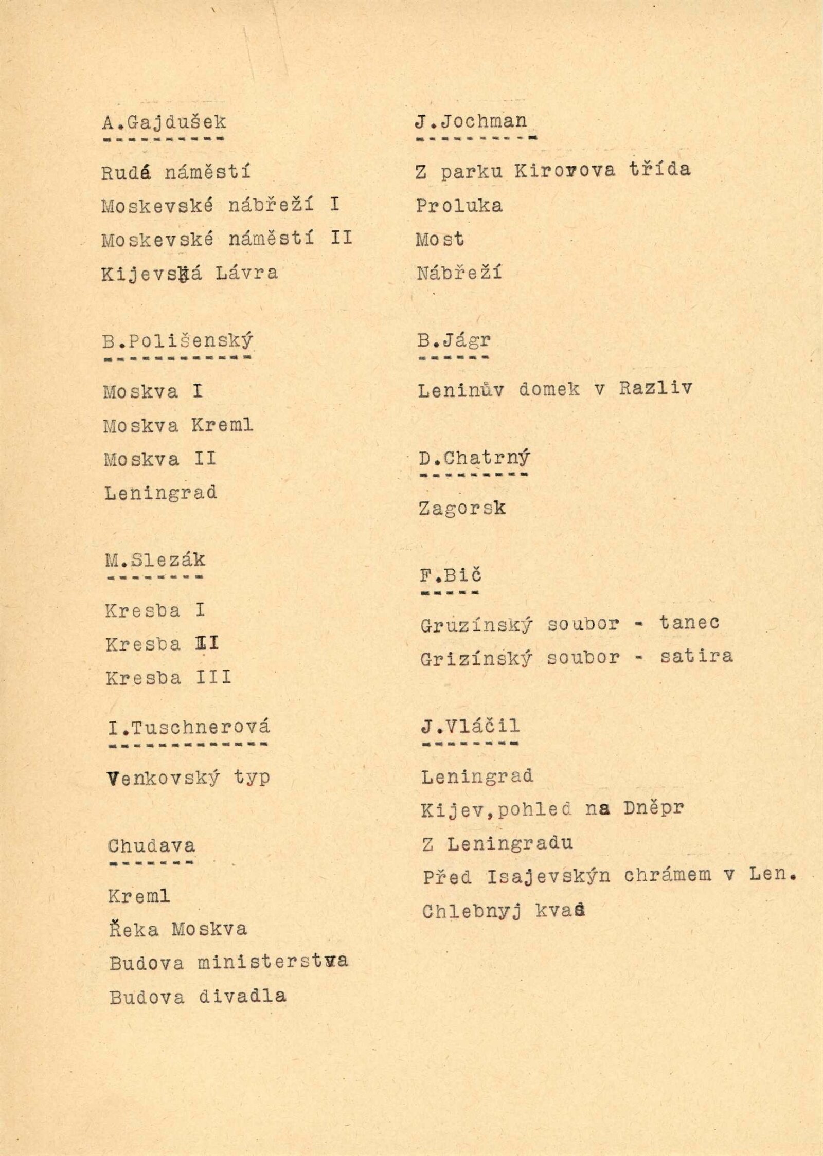 Inez Tuschnerová, Svatopluk Chudara, Miloš Slezák, Břetislav Polišenský, Antonín Gajdušek, Josef Jochman, Bohuslav Jágr, Dalibor Chatrný, František Bič, Jiří Vláčil, Vašíček, Helena Bochořáková-Dittrichová, Jan Rajlich