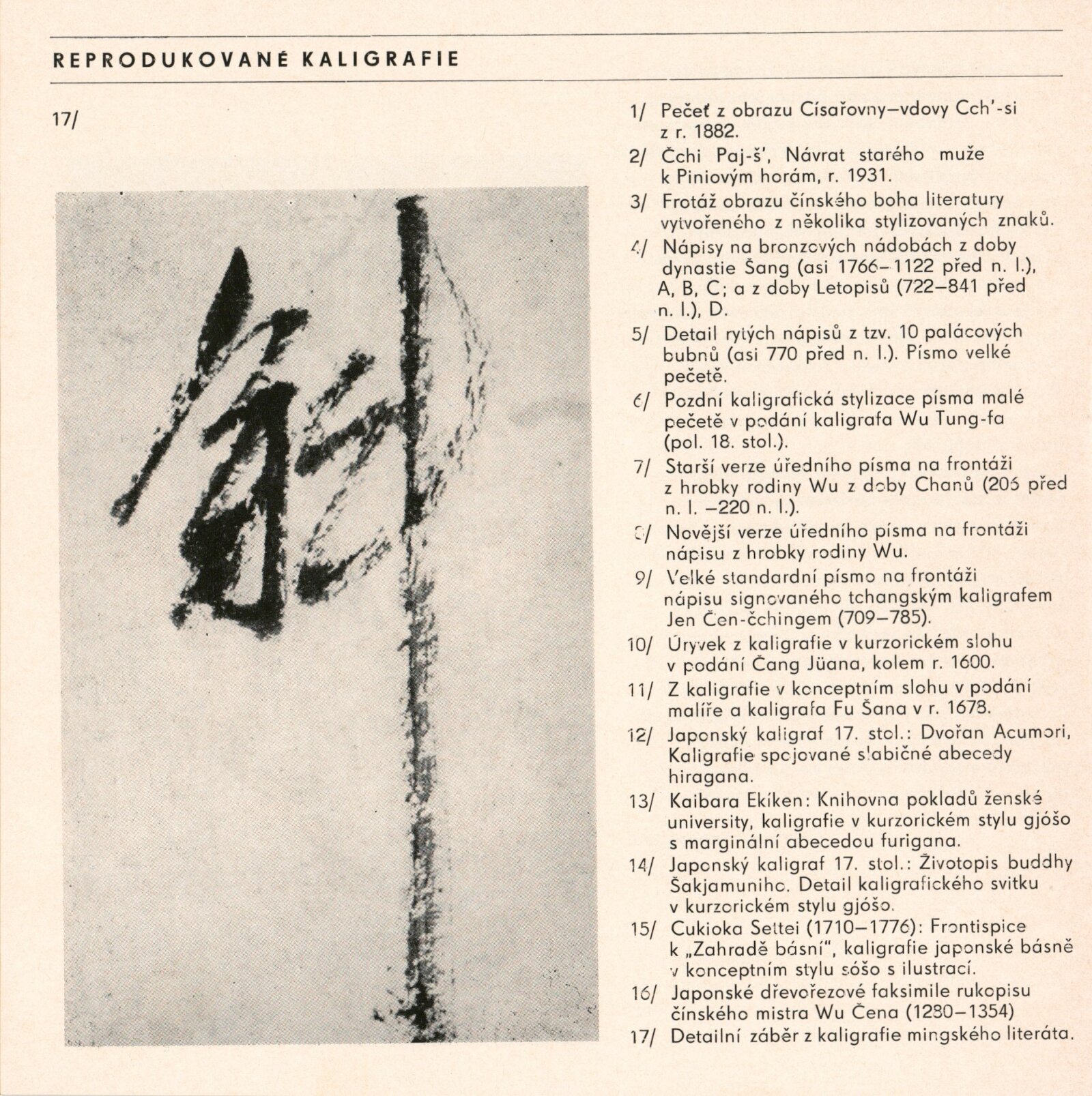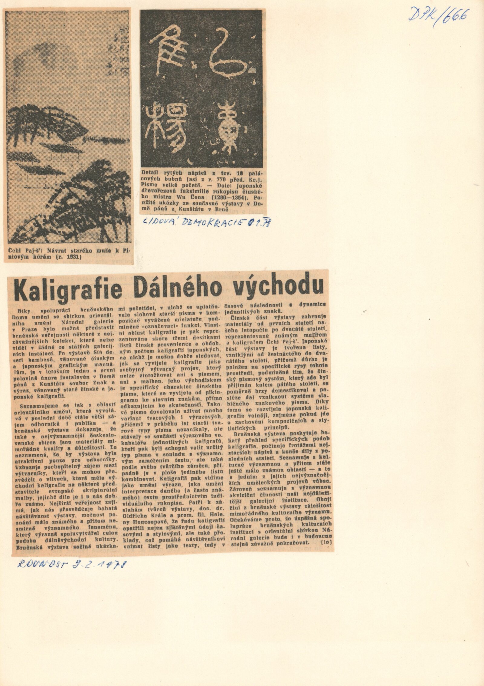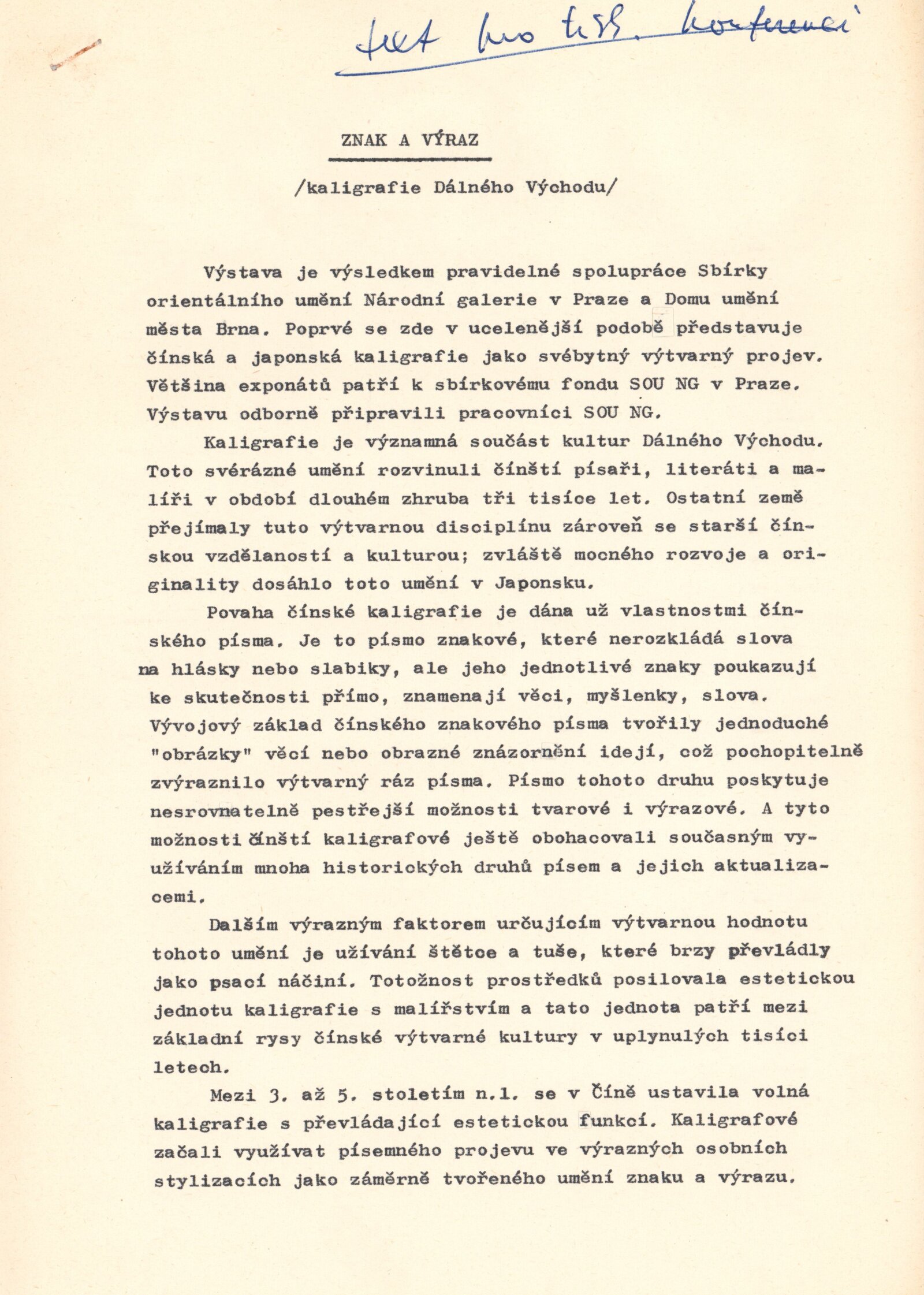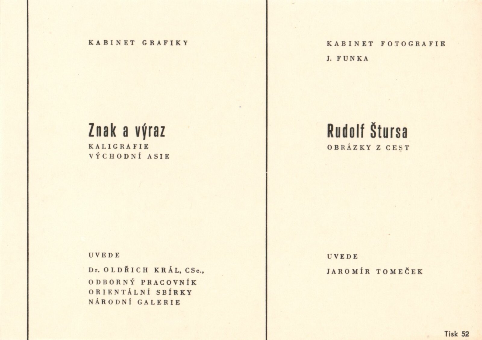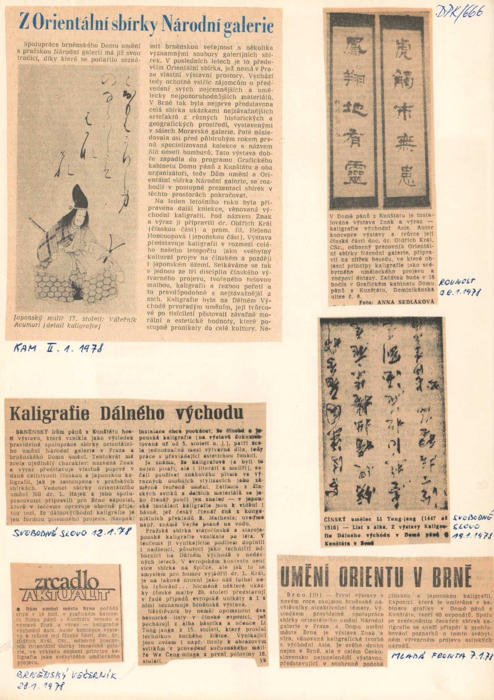Znak a výraz. Kaligrafie Dálného východu: Kabinet grafiky, 168. výstava, Dům pánů z Kunštátu 6. 1. – 12. 2. 1978 / Texty Oldřich král, Helena Honcoopová. - Brno: DUmB, - 16 s., obr. + Katalog 4 s. DPK 666; MZK