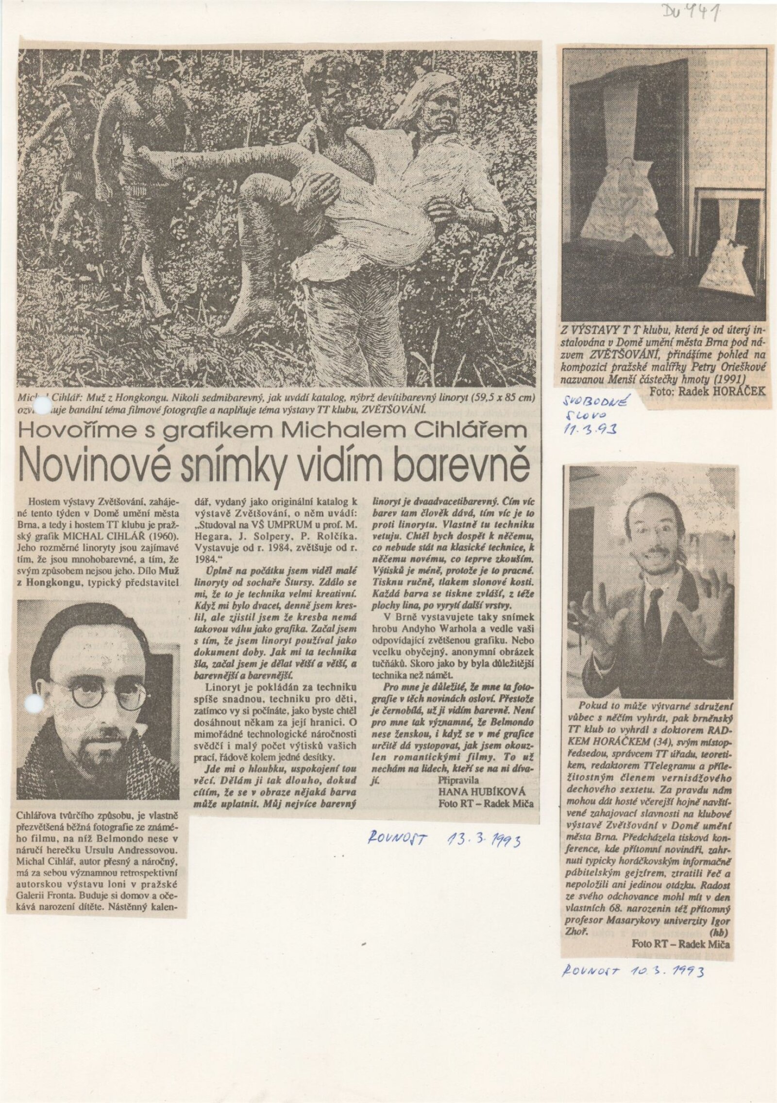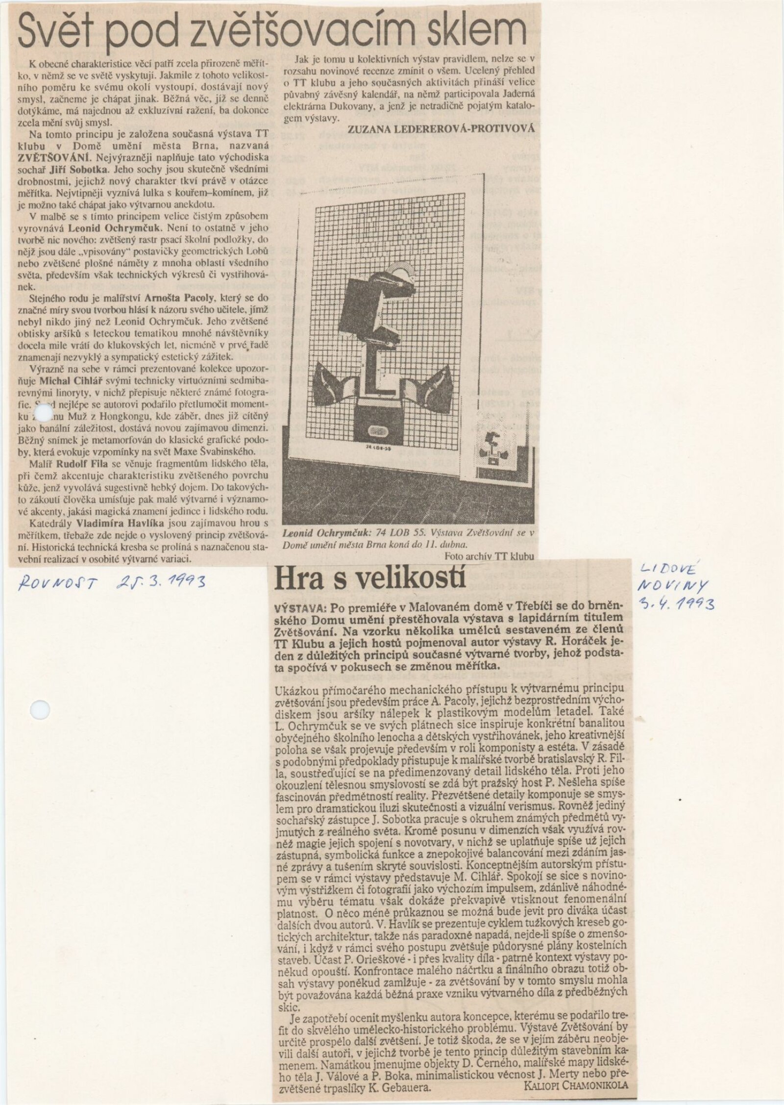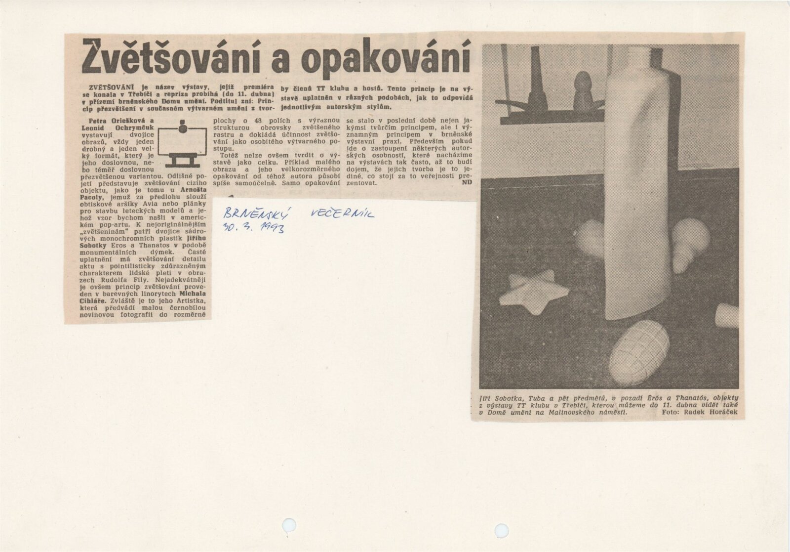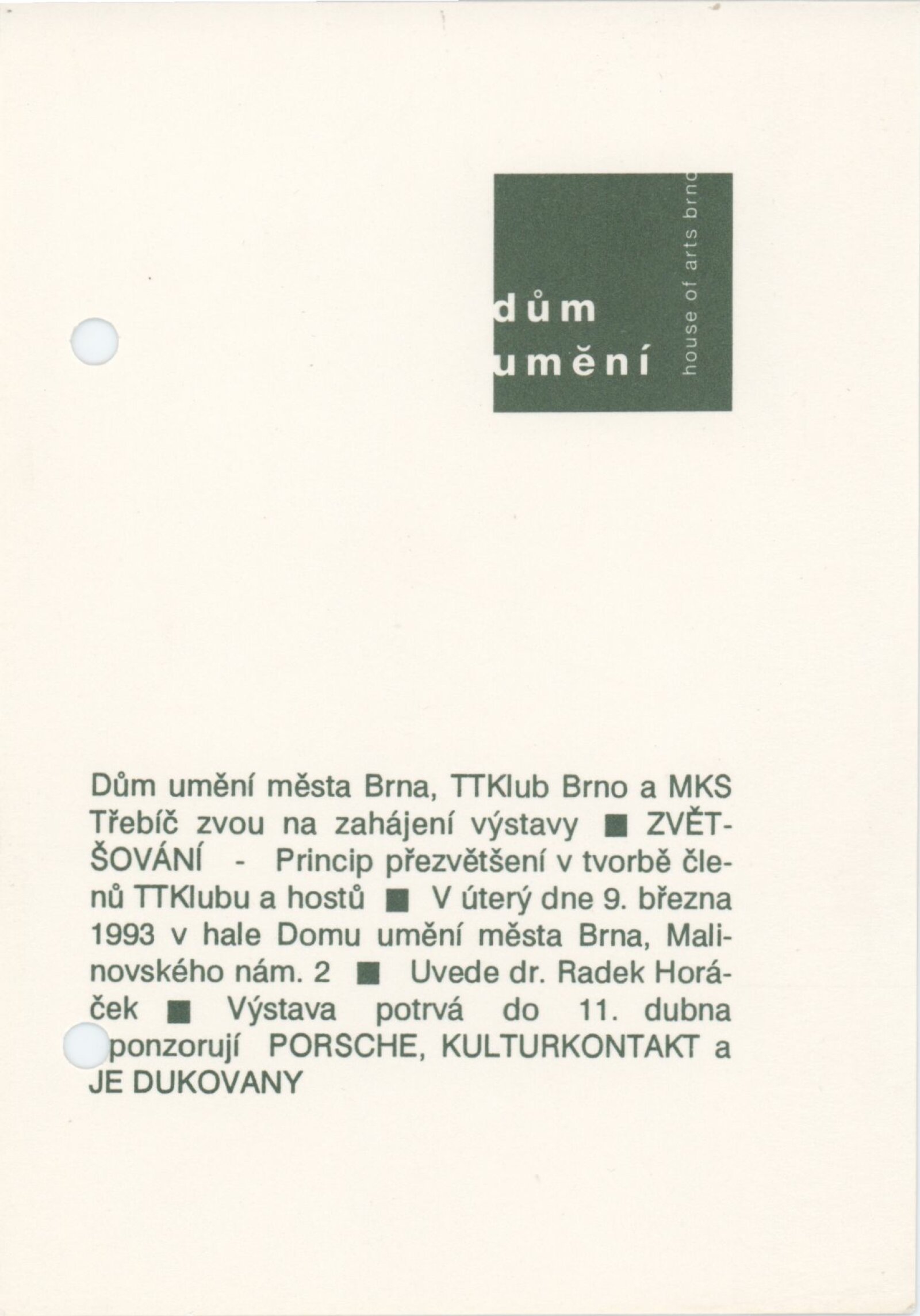 Zvětšování. Princip přezvětšení v současném výtvarném umění z tvorby členů TT klubu a hostů: 7. výstava TT klubu ... Dům umění města Brna 13. 3. – 4. 4. 1993 / Text Radek Horáček. - Brno: TT klub výtvarných umělců, - [26] s., obr. Životní data vystavujících. Vyšlo jako nástěnný kalendář na spirále na rok 1993 DU 941