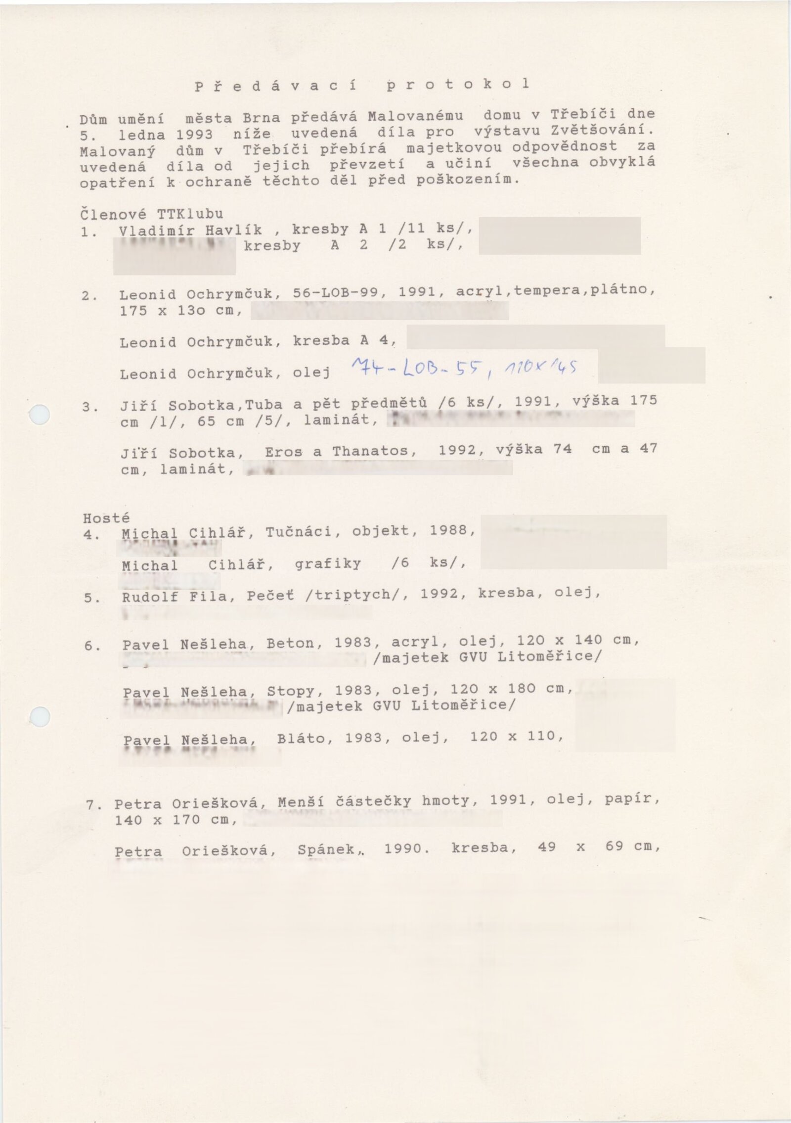 pozvánka, korespondence, potvrzení o převzetí, žádost o výstavní termín pro rok 1993, recenze v tisku, pozvánka pro výstavu v Třebíči 1993 (v DU repríza této výstavy)